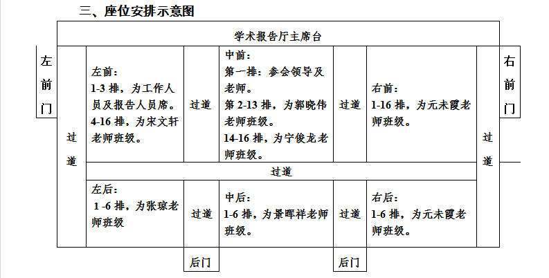 1.请各辅导员提前5分钟组织好本班级学生按指定区域就座。