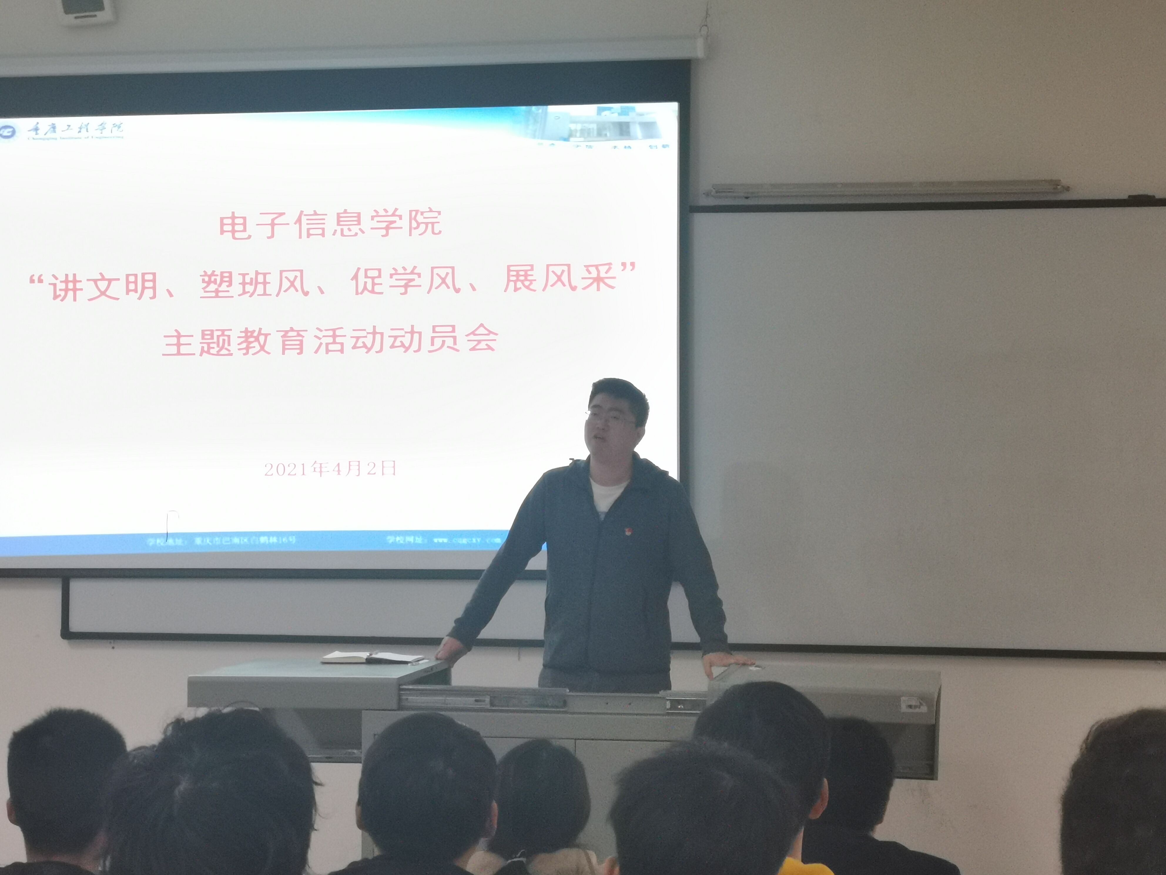 为积极响应和贯彻落实学校“两个问好”主题教育宣传活动和进一步积极推动“红蓝绿”班级文化建设,电子信息学院于2021年4月2日中午12:30分在6教202教室开展“讲文明、塑班风、促学风、展风采”主题教育活动,学院党总支书记谭思宇、全体辅导员老师、全体团学干部以及2018级、2019级班委干部代表参加了本次动员会。会上学生科长景晖祥宣读了电子信息学院关于实施“两个问好”的通知,党总支书记谭思宇重点解读了“红蓝绿”班级文化建设方案并对此项工作作安排部署。