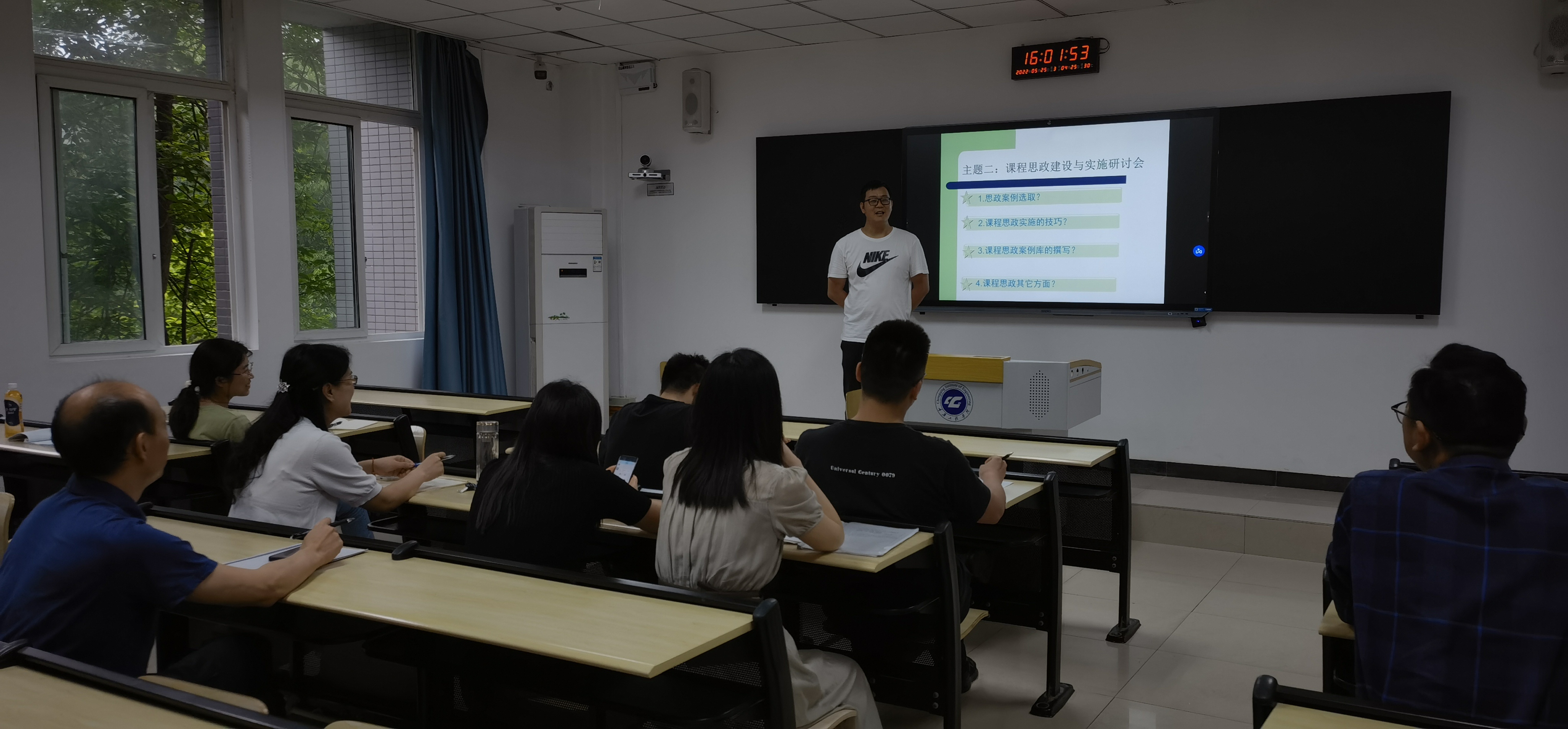 教师们积极发言,对思政案例如何选取、课程思政实施的技巧如何操作及课程思政案例库如何撰写等进行了激烈的讨论。在“课程思政建设与实施”的交流中,李成勇主任结合自己课程思政示范课程建设的体会,从课程思政的教学建设、课程思政的教学设计与实施两个方面与老师们做了分享。李成勇主任强调指出:课程思政案例撰写应实事求是、与时俱进,体现准确性、实用性要求。