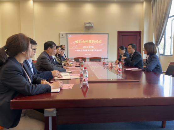 为进一步贯彻落实 “校企合作、产教融合”人才培养模式,不断深化校企协同育人机制,2022年10月31日,重庆工程学院与中国电信股份有限公司巴南分公司在前期良好合作基础上,就与电子信息学院专业建设、共建校内外实习实训基地以及学术科研合作等事宜进一步达成深度合作共识,在行政楼第六会议室举行了校企合作协议签约仪式。中国电信股份有限公司巴南分公司副总经理郑世洪、教育运营中心总监缪桂斌、政企客户经理彭雪,学校党委副书记、常务副校长张业平、教务处处长杨倩、网络信息中心主任皮小军、电子信息学院院长何世彪、评建办许欢欢、校企合作办公室宁俊龙出席签约仪式,签约仪式由电子信息学院副院长陈成瑞主持。