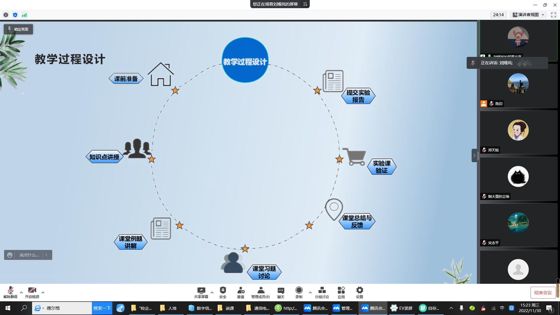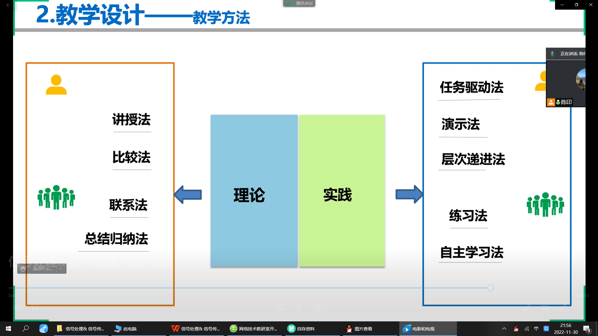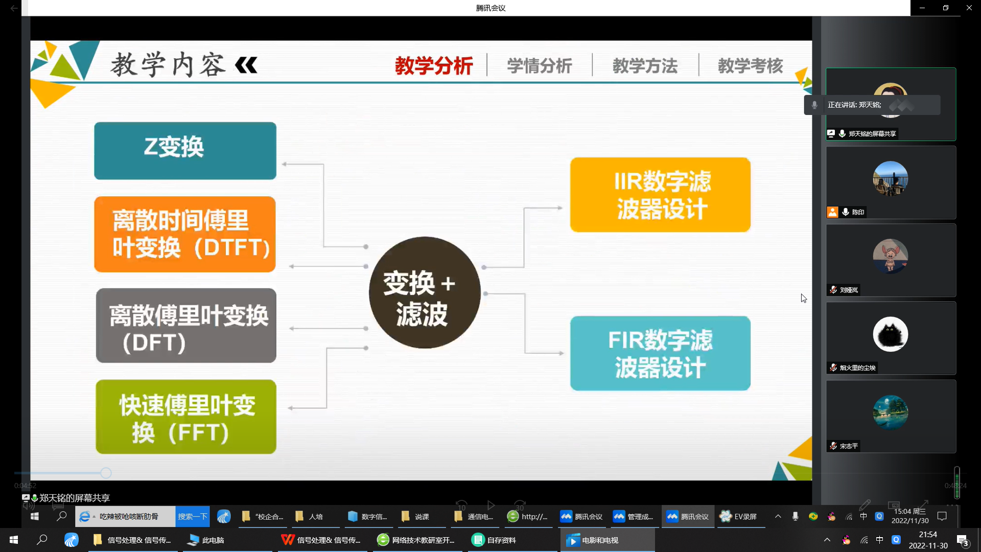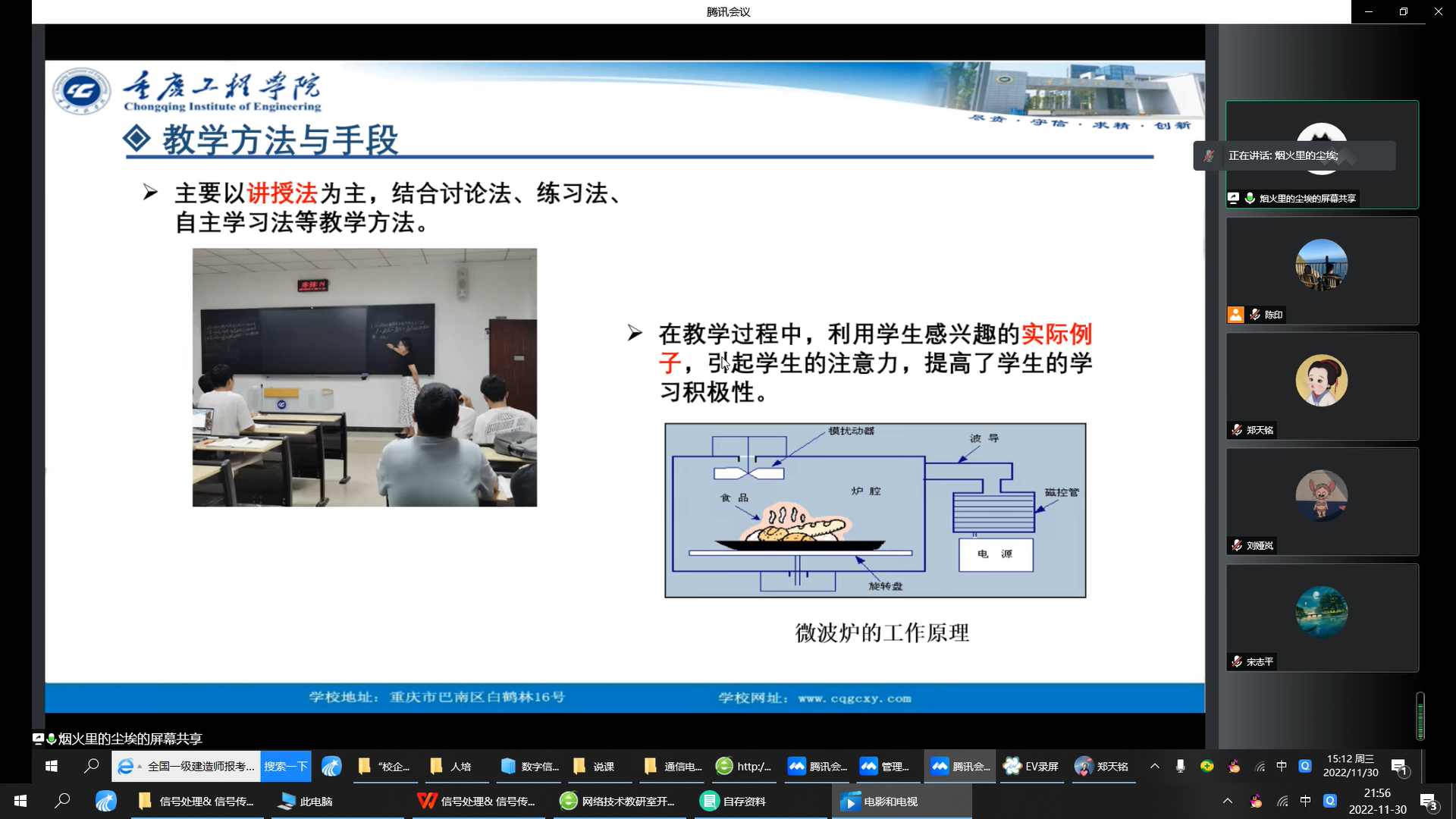 为进一步提高教师教学水平,推进教学内容、教学方法改革,提升课堂教学质量,11月30日,根据电子信息学院统一安排,信号处理和信号传输课程组在腾讯会议上开展“说课”活动,陈印、郑天铭、郑庭丽、刘娅岚、宋志平、陈春梅6位老师参加了此次活动。