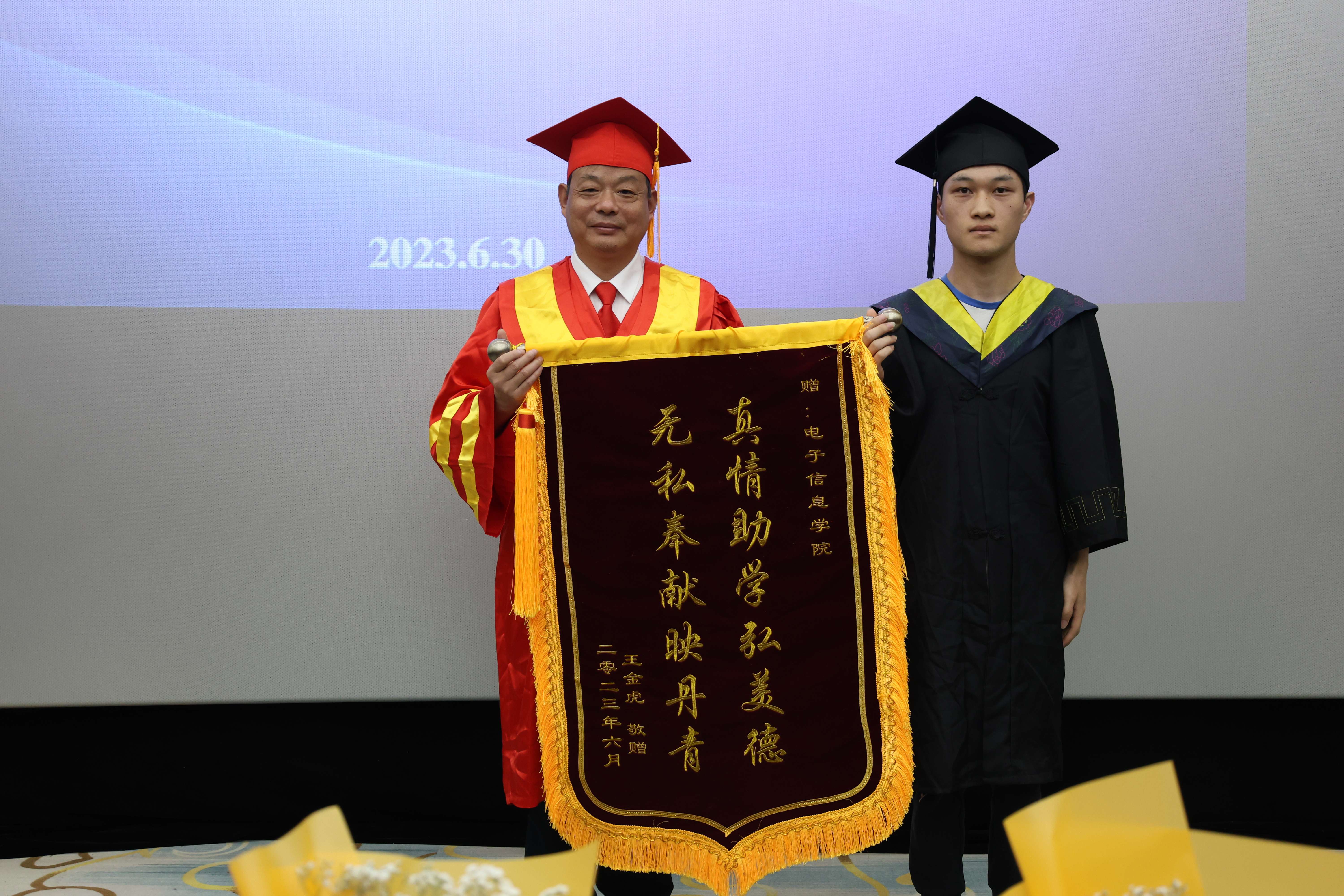 6月30日,电子信息学院在学校办公楼阶梯报告厅举行2023届学生毕业典礼暨学士学位授予仪式,学院学位评定分委员会全体成员、教师代表、毕业班辅导员、学院2023届本科毕业生参加毕业典礼。仪式由党总支书记谭思宇主持。