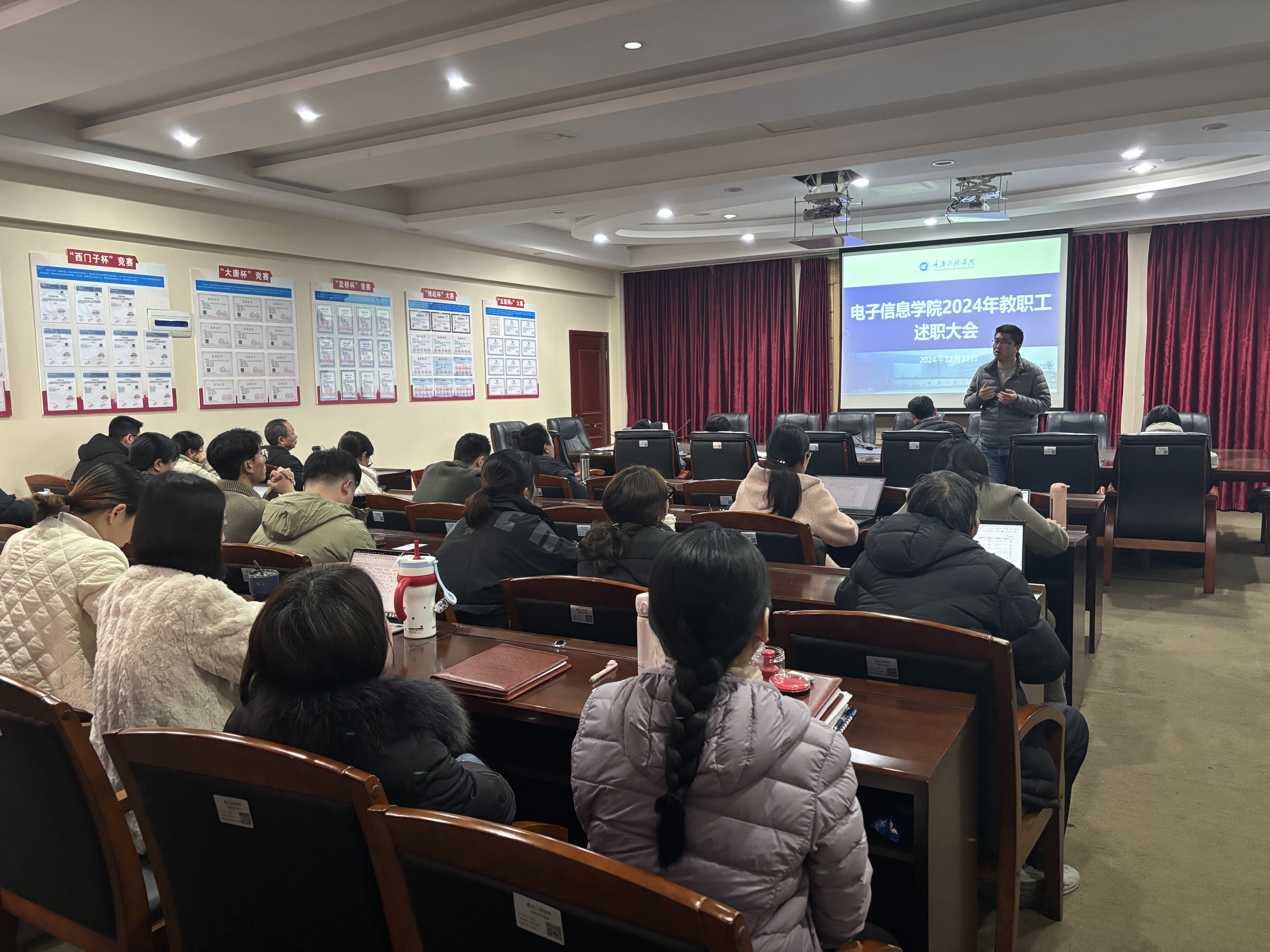 为全面总结 2024年度工作,加强队伍建设,明确未来发展方向,电子信息学院依据学校 2024 年二级单位及个人年度考核预通知与相关文件精神,严格参照《电子信息学院教职工绩效考核实施办法》,于12月27日在办公楼212会议室召开教职工年终述职大会,学院领导班子、全体教职工参加。