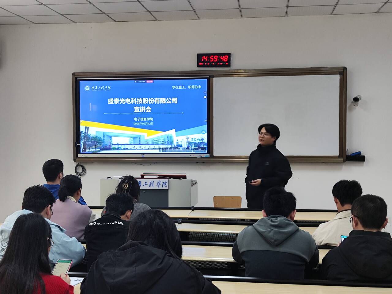 3 月 12 日下午,电子信息学院邀请盛泰光电科技股份有限公司在 6 教 102举行宣讲会。本次主要招聘工程技术类、品质管理类、产品管理类岗位,吸引了2025 届共计 45 名学生积极参与。