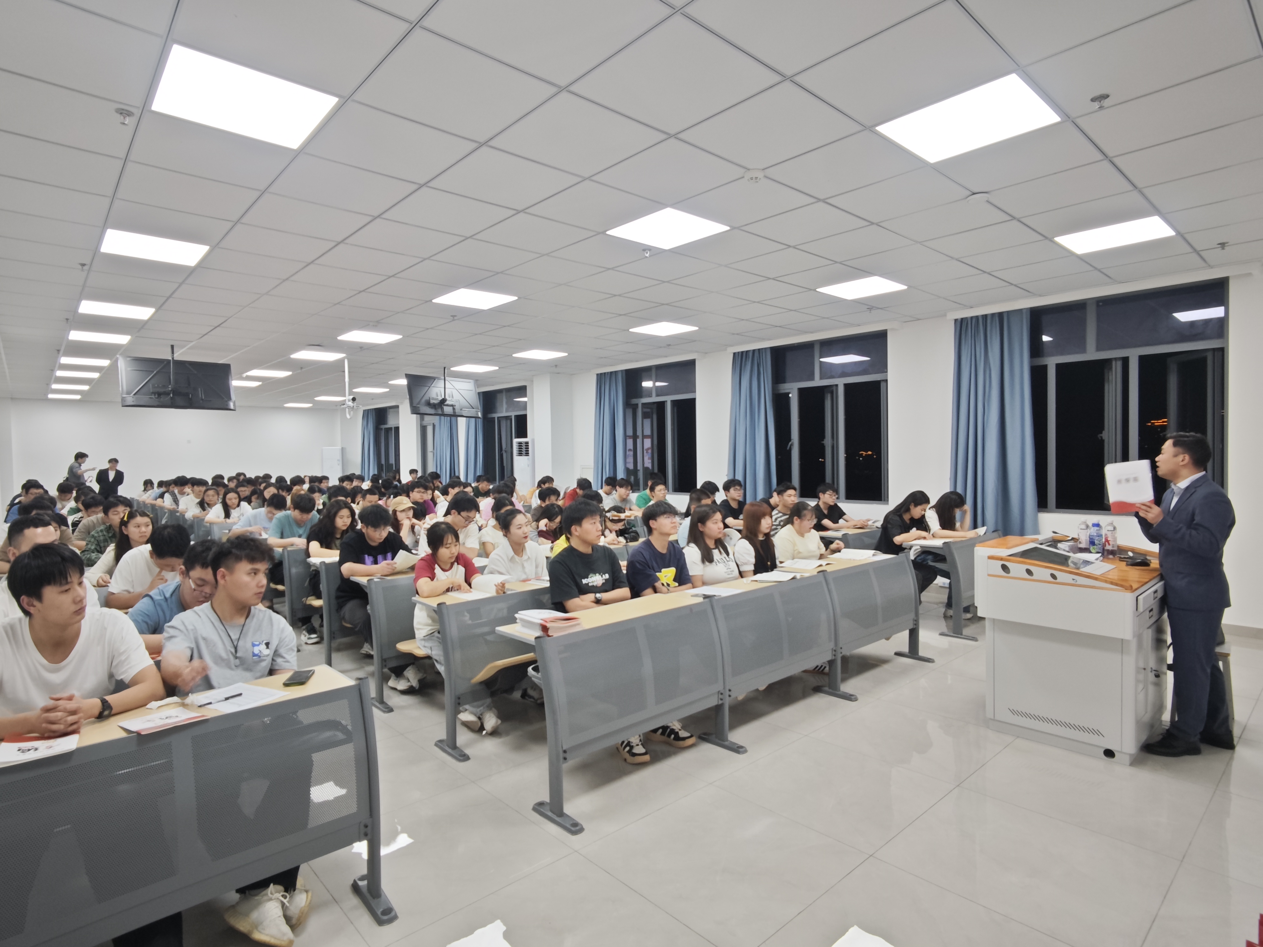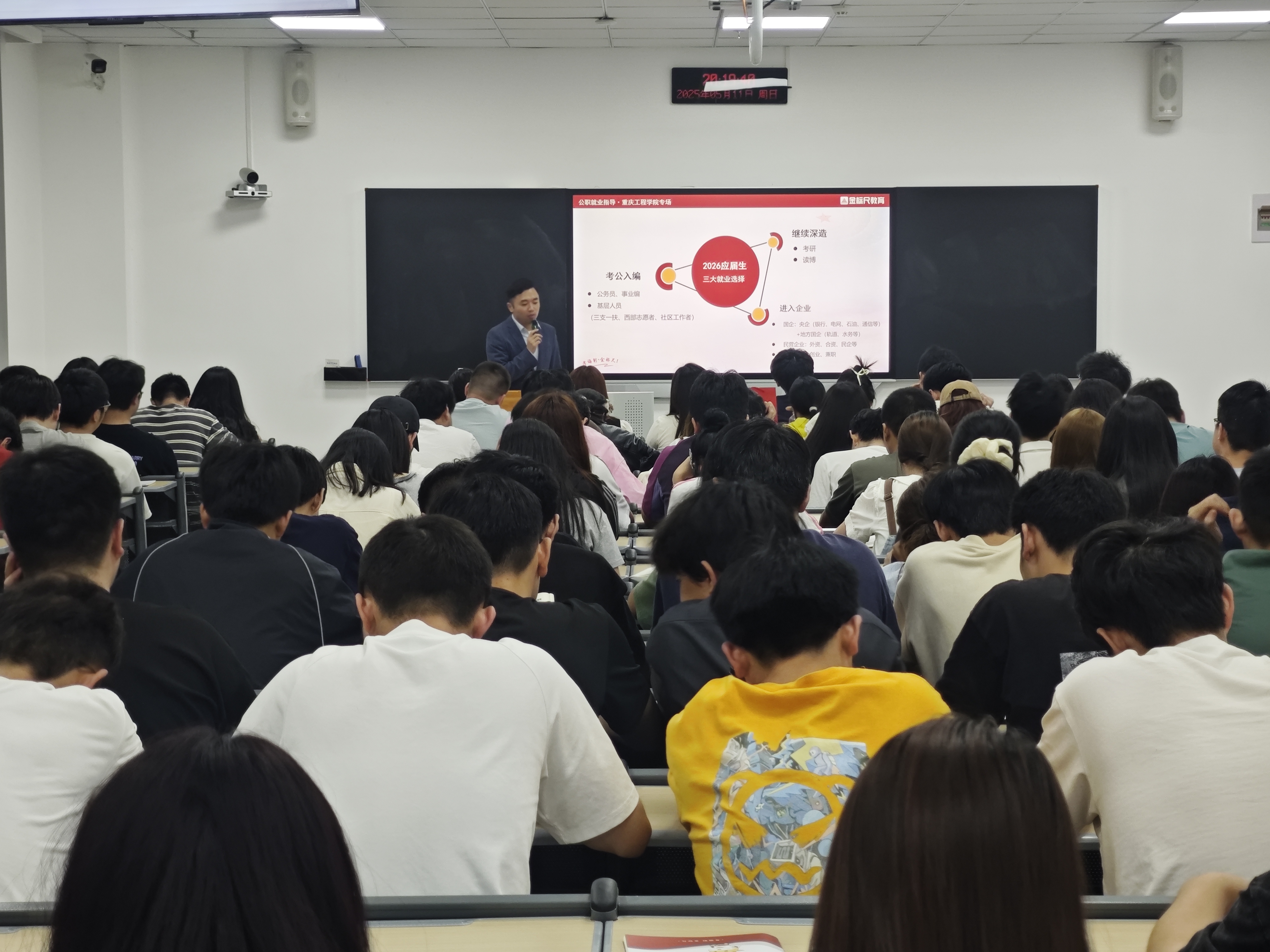 2025 年 5 月 11 日 20:00,电子信息学院邀请金标尺教育的高级讲师冉江涛先生面向专升本学生开展“公职就业指导”讲座,深入剖析公职就业形势并提供备考指引,共有 140 名学生参加。讲座开篇引导学生关注大四的就业抉择,明确深造、考公入编、进企业三大路径。其中,对公职类岗位的讲解尤为细致,解读了公务员、事业单位、军队文职等岗位特点,还展示各地公职人员收入情况,让学生有直观认知。