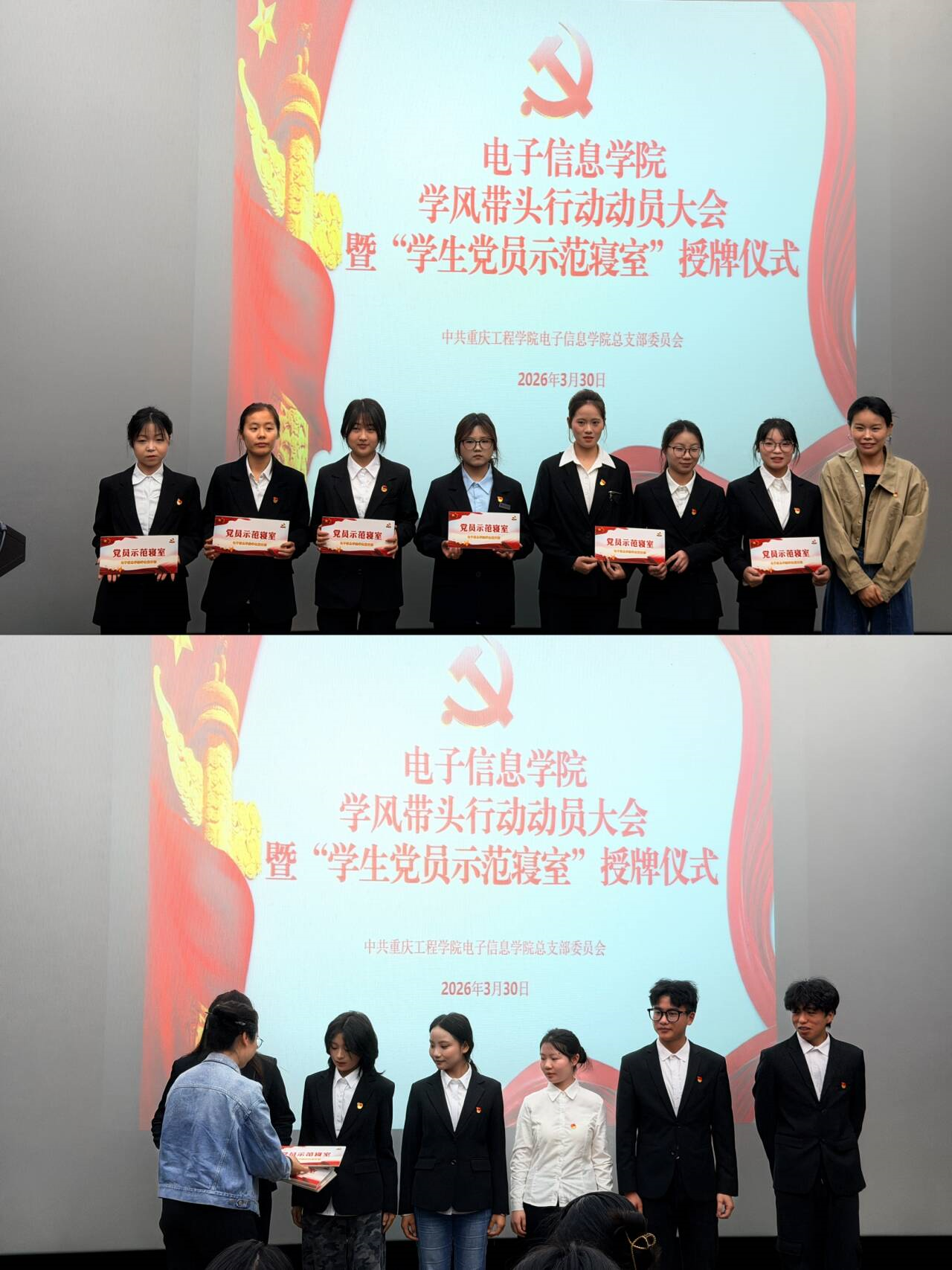 随后由党总支书记谭思宇宣读关于“学生党员示范寝室”授牌名单的文件,由电子信息工程专业学生党支部书记向悉嘉、通信工程专业学生党支部书记秦琴分别为学生党员示范寝室授牌。
