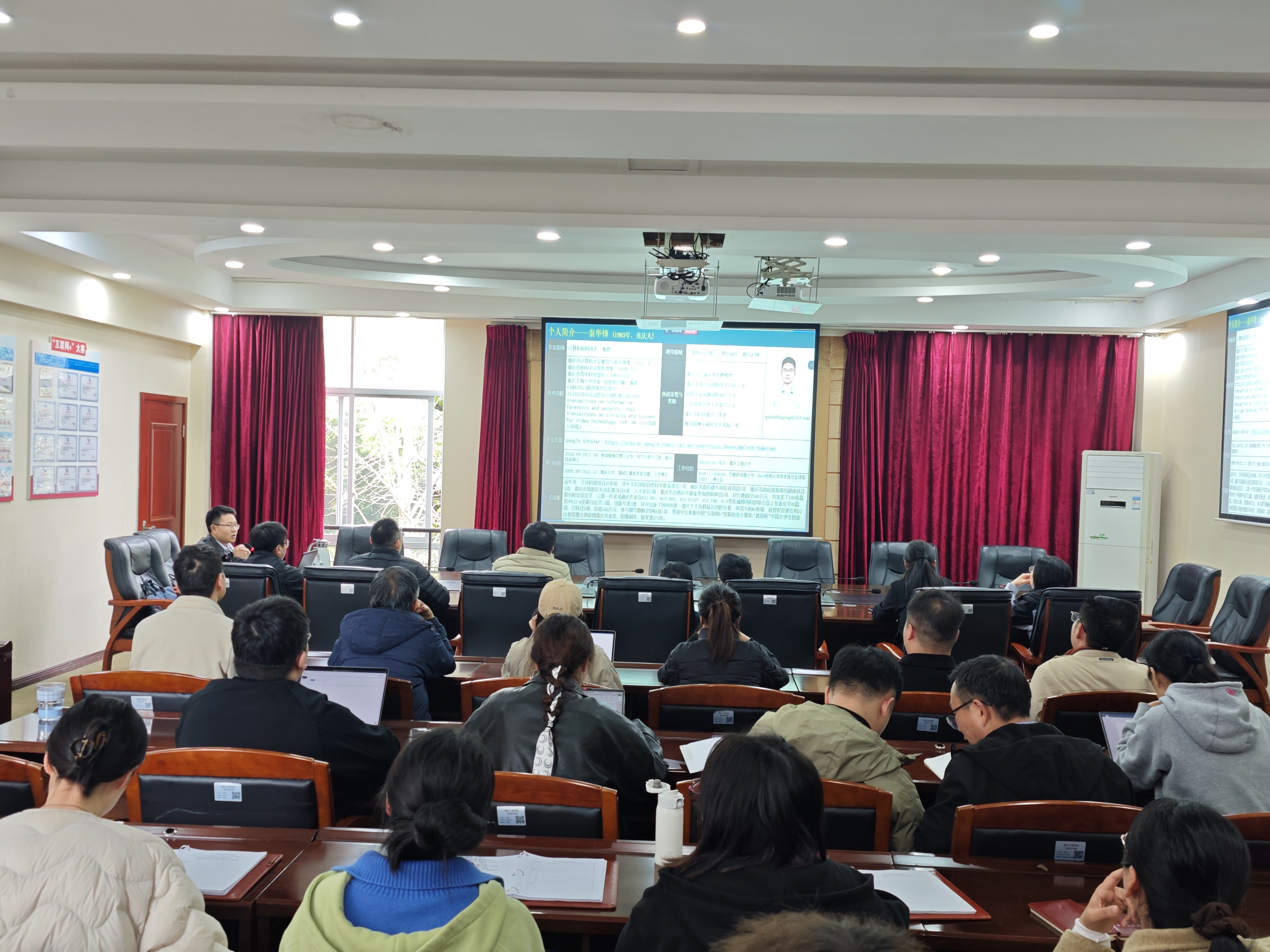 2026 年 3 月 25 日下午,电子信息学院在 212 会议室举办科研项目与学术论文撰写专题讲座,特邀重庆工商大学秦华锋教授担任主讲。学院全体教职工参会,双桥校区教师线上同步聆听。讲座由副院长张仁永主持。