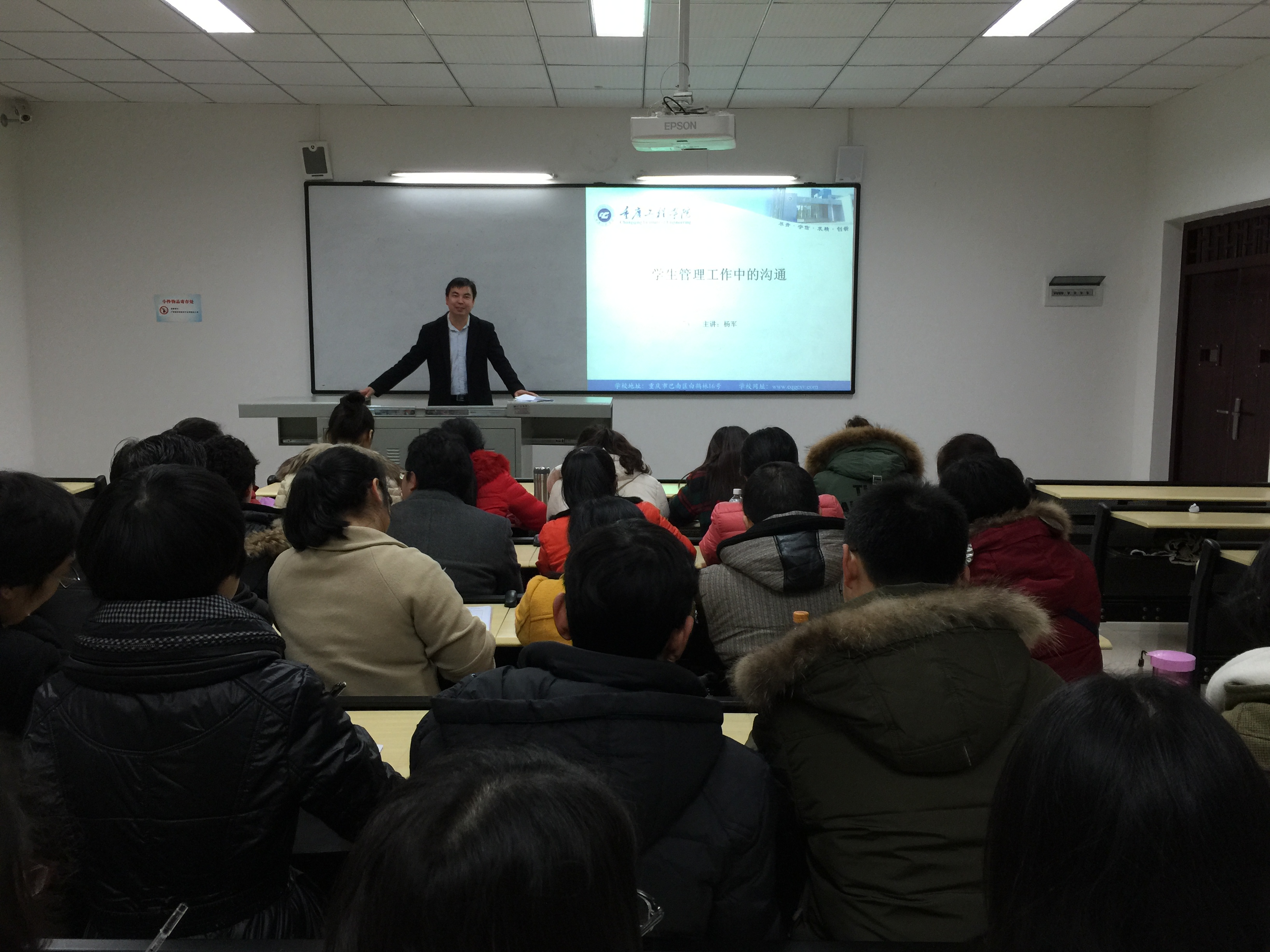 2015年12月18日13:20,管理学院教师讲坛第五讲在6106教室举行,本次讲座由杨军老师主讲,主题为“学生管理工作中的沟通艺术”。杨老师主要讲了爱心是沟通的基础、积极聆听、换位思考、师生沟通中的口语艺术,最后还举了一个案例与在场的老师们探讨。