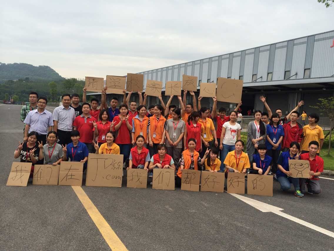 会后熊书记及与会的公司负责人还有全体实习同学们合影留念,而学生高举着自制的写有“我们在京东好好的”、“请家长和学校放心”的纸板,表达的学生们欣喜的心情。