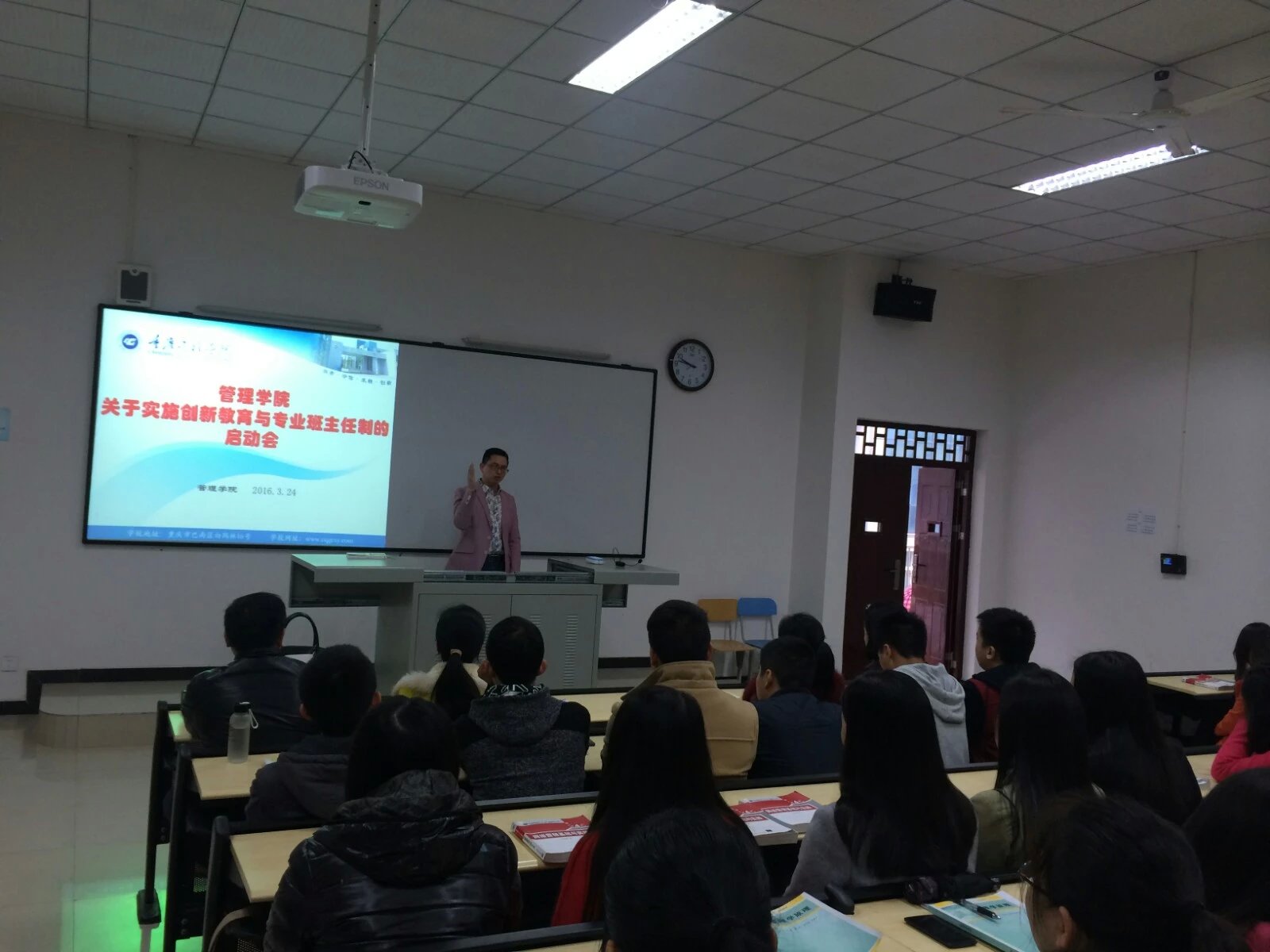 2016年3月24日,管理学院在6教203室召开了“关于实施创新教育与专业班主任制”的启动会,学院院长简玉刚、党总支书记熊力、工商管理教研室主任朱凤以及部分专业教师代表和200多名14级市场营销专业同学参加此次会议。