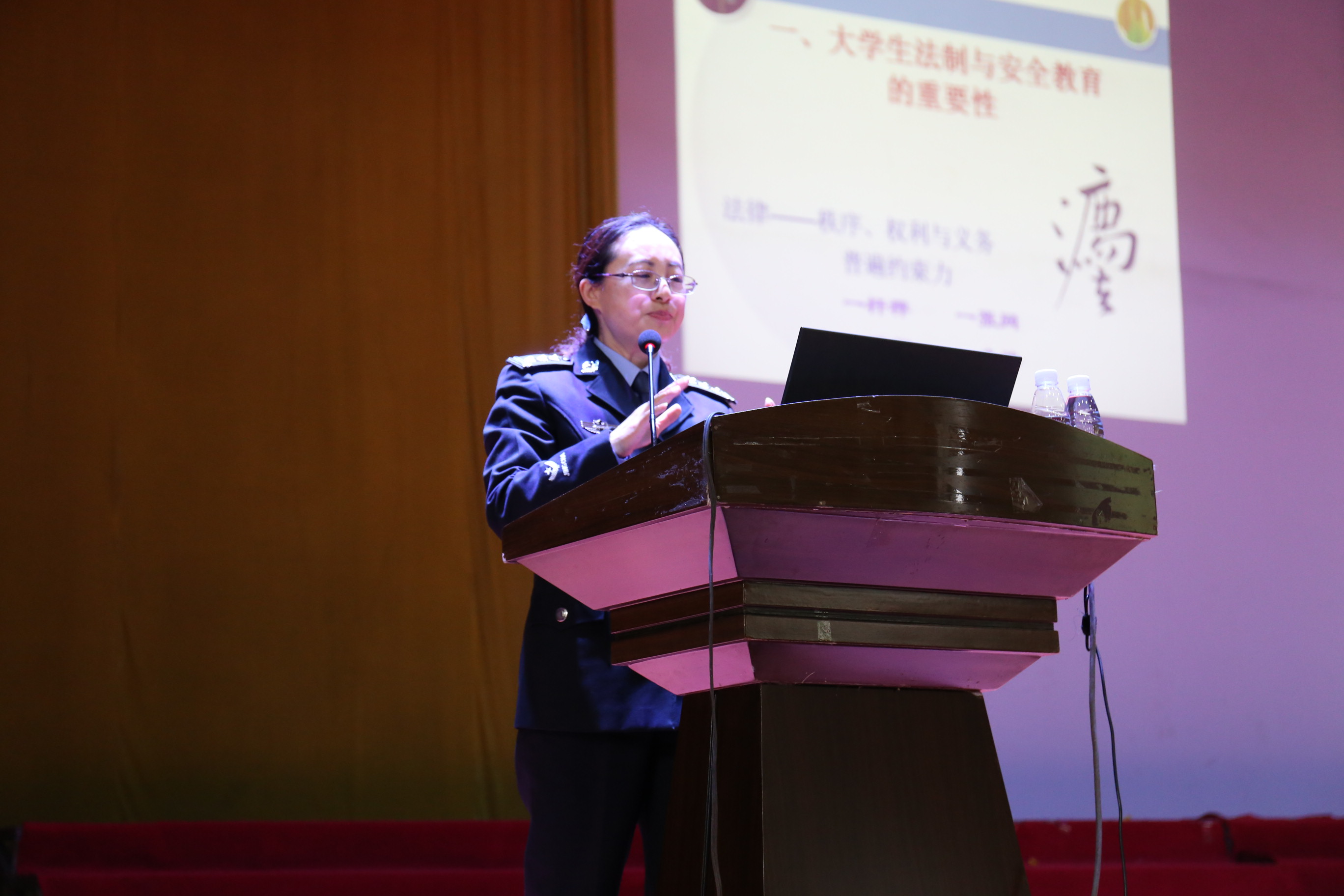 为了增强学生的自我保护意识,让学生养成学法、懂法、依法办事的好习惯,有效地树立和维护学校良好的学风以及社会的稳定发展。管理学院特邀请重庆警察学院首届名师、治安学学科带头人,治安系副主任,西南政法大学警察科学硕士研究生导师,重庆市法学会会员,全国公安教育系统优秀教师陈菊娟教授,为管理学院南泉校区全体在校学生于2016年4月4日下午在学校学术报告厅做主题为“大学生法制与安全教育”的讲座。