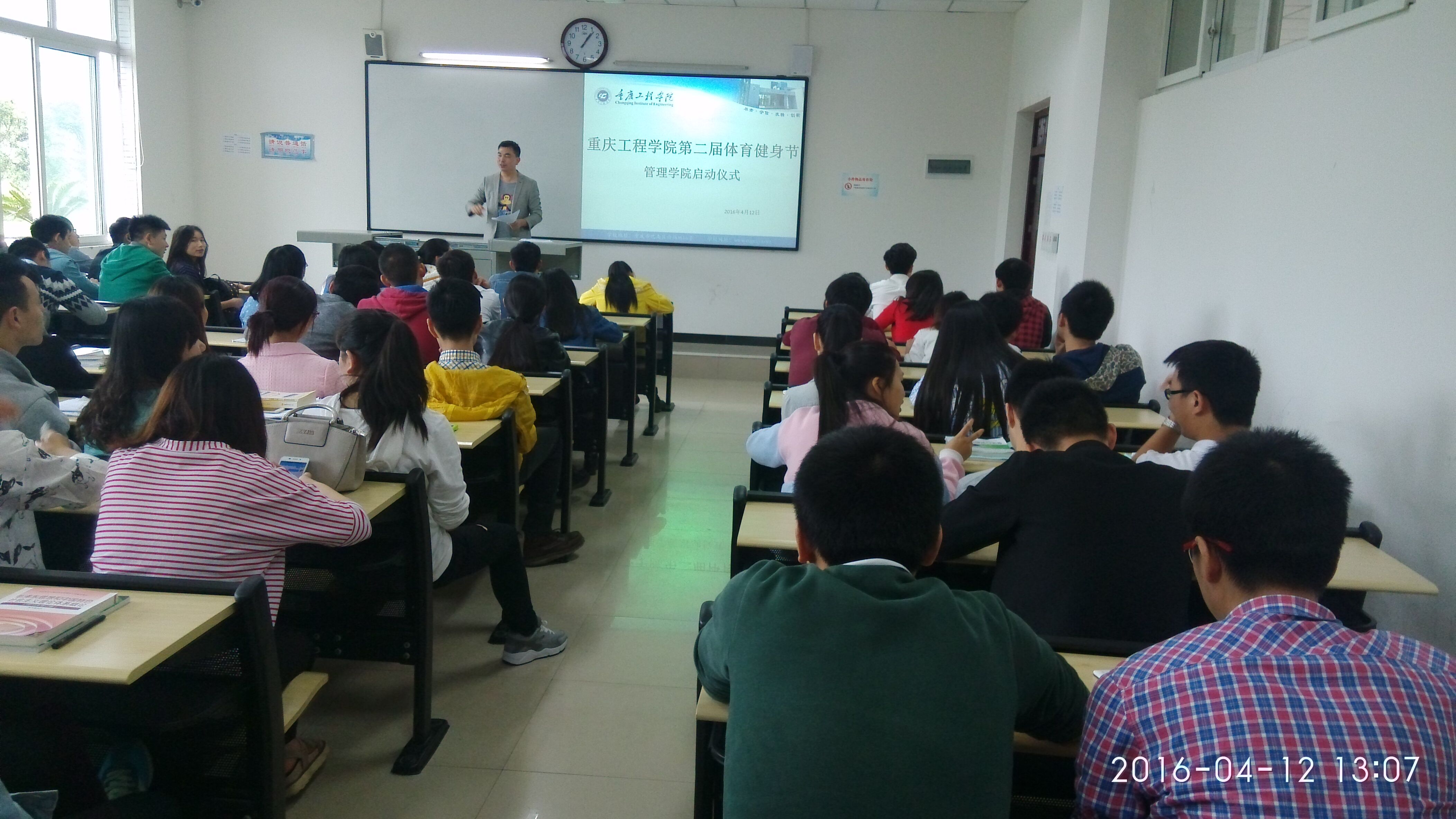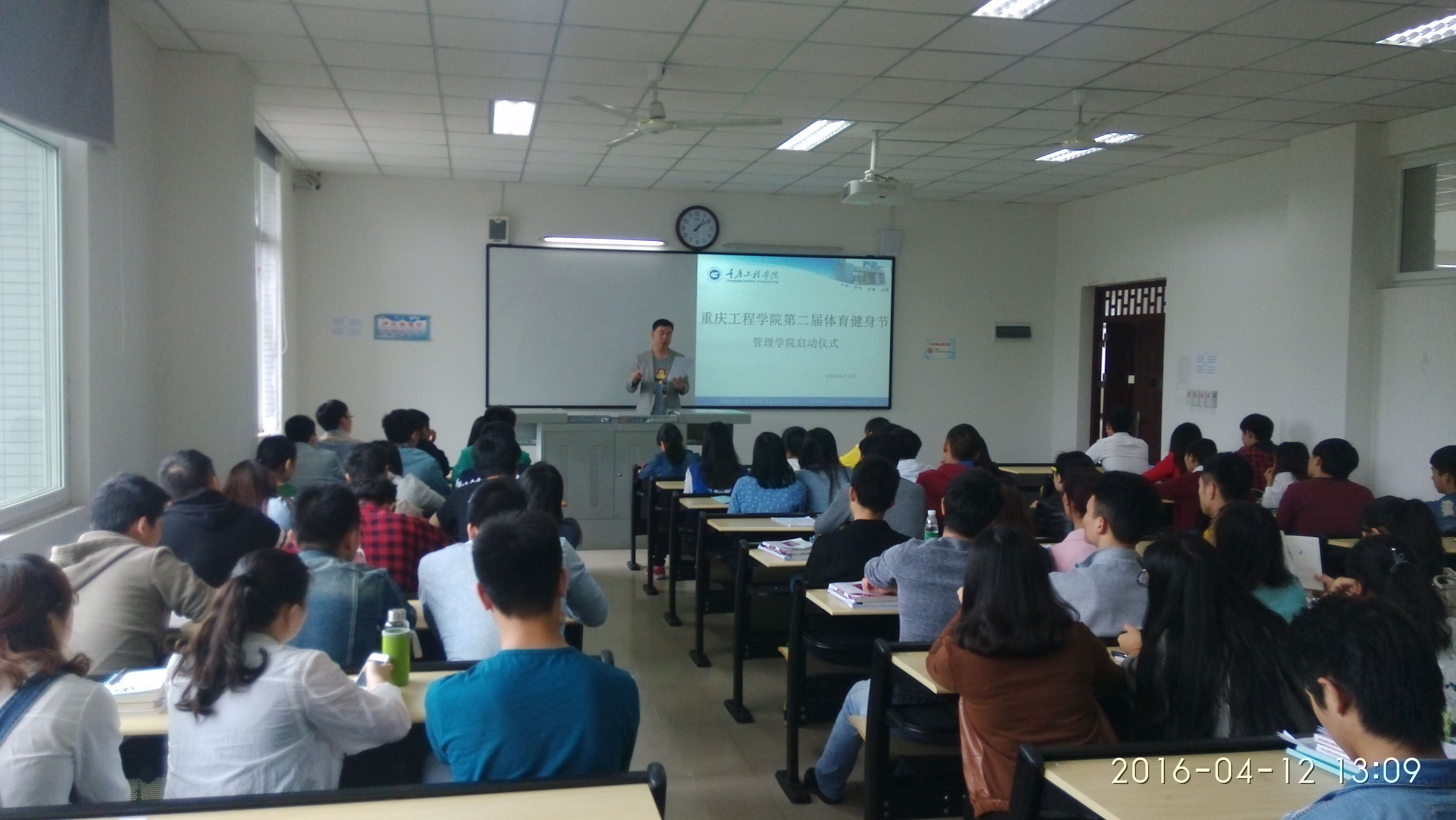在这春意盎然之季,管理学院全体学生迎来了重庆工程学院第二届体育健身节。为了更好的开展本次体育健身节,2016年4月12日下午1:00,管理学院学生工作室主任杨军在学校6教115教室,主持召开了第二届体育健身节——管理学院启动大会,参加本次启动大会的是管理学院全体班干部,及团学会代表。
