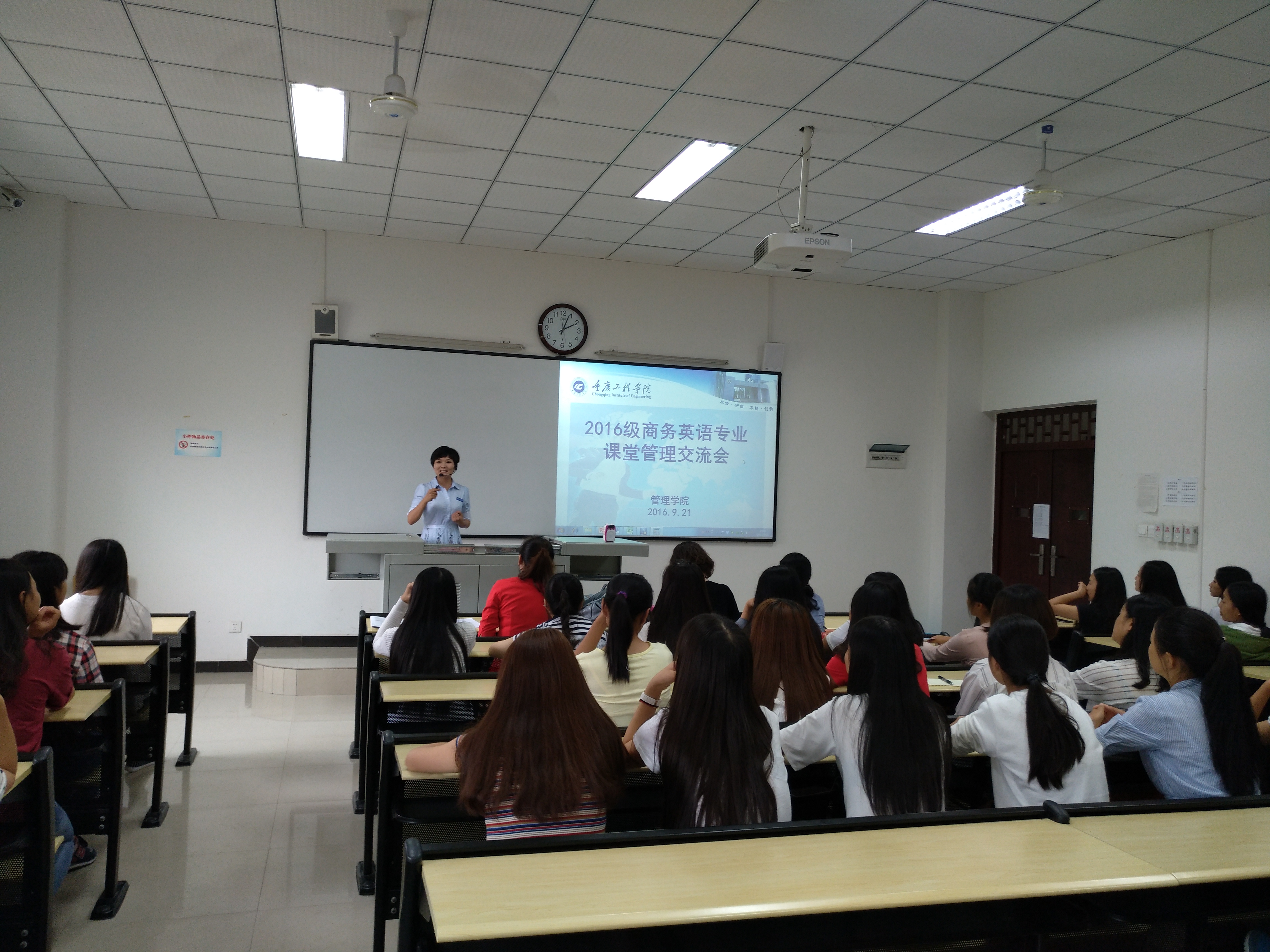2016年9月21日下午14:00-15:00,国贸教研组针对16级商务英语专业学生开展了“课堂管理专题交流会”,主要针对学校的学籍管理制度、管理学院学风建设管理办法进行了解读,带领16级新生了解相关学分学籍管理、课堂管理制度及规范。