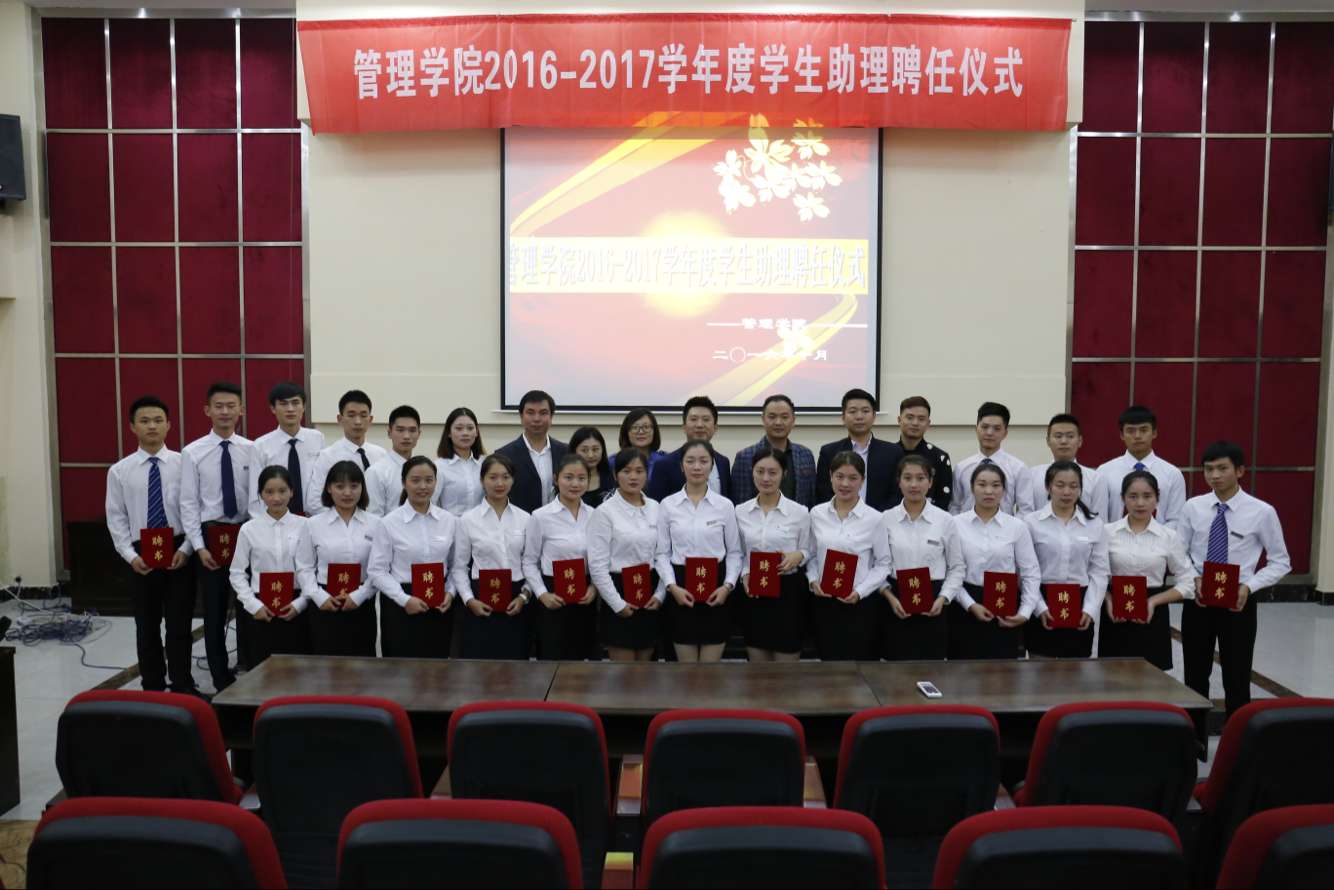 10月13日晚管理学院在学校阶梯报告厅,举行了2016-2017学年度学生助理聘任仪式,校学生处长邹均,素质教育中心副主任黄燕,团委副书记黄涛,学院党总支书记熊力参加仪式。