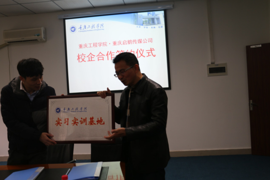 (管理学院)2016年12月1日上午,我校与重庆启鹅传媒科技有限公司(下称启鹅传媒)在实习楼104会议室举行了校企合作签约暨授牌仪式,我校管理学院院长简玉刚、校企合作办主任秦凤梅、软件学院副院长陈佚伶、软件工程训练中心副主任冷亚洪 、管理工程训练中心副主任张金波 、管理学院电子商务教研室主任廖俊及启鹅传媒公司副总经理雷袆、技术部总监李卫、技术部经理程龙、营销1战区总监周鹏、营销2战区总监刘勇、贵阳分公司总监吴浪、人力行政部经理杜丽丽、人事专员陈颖等人出席了本次签约仪式。