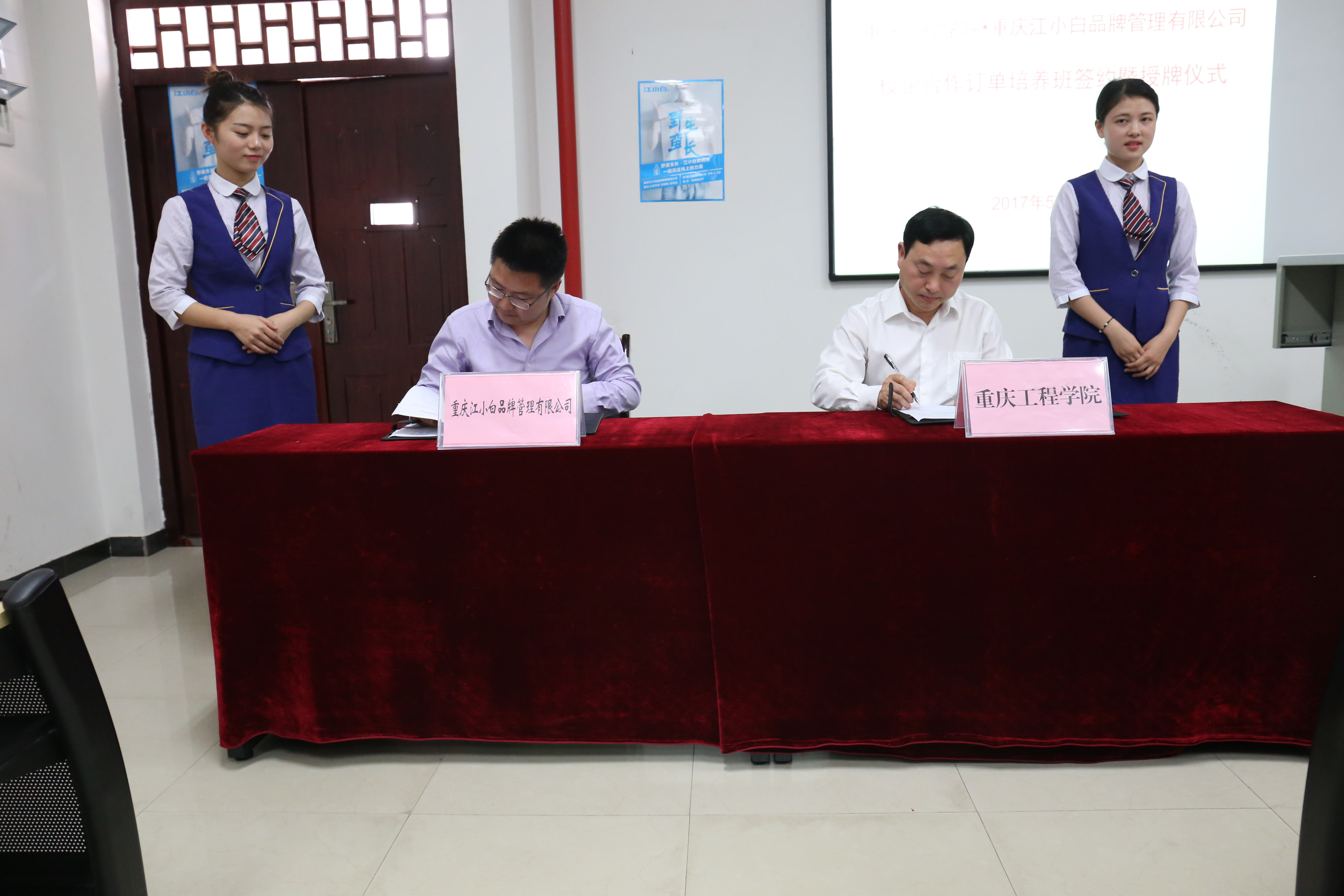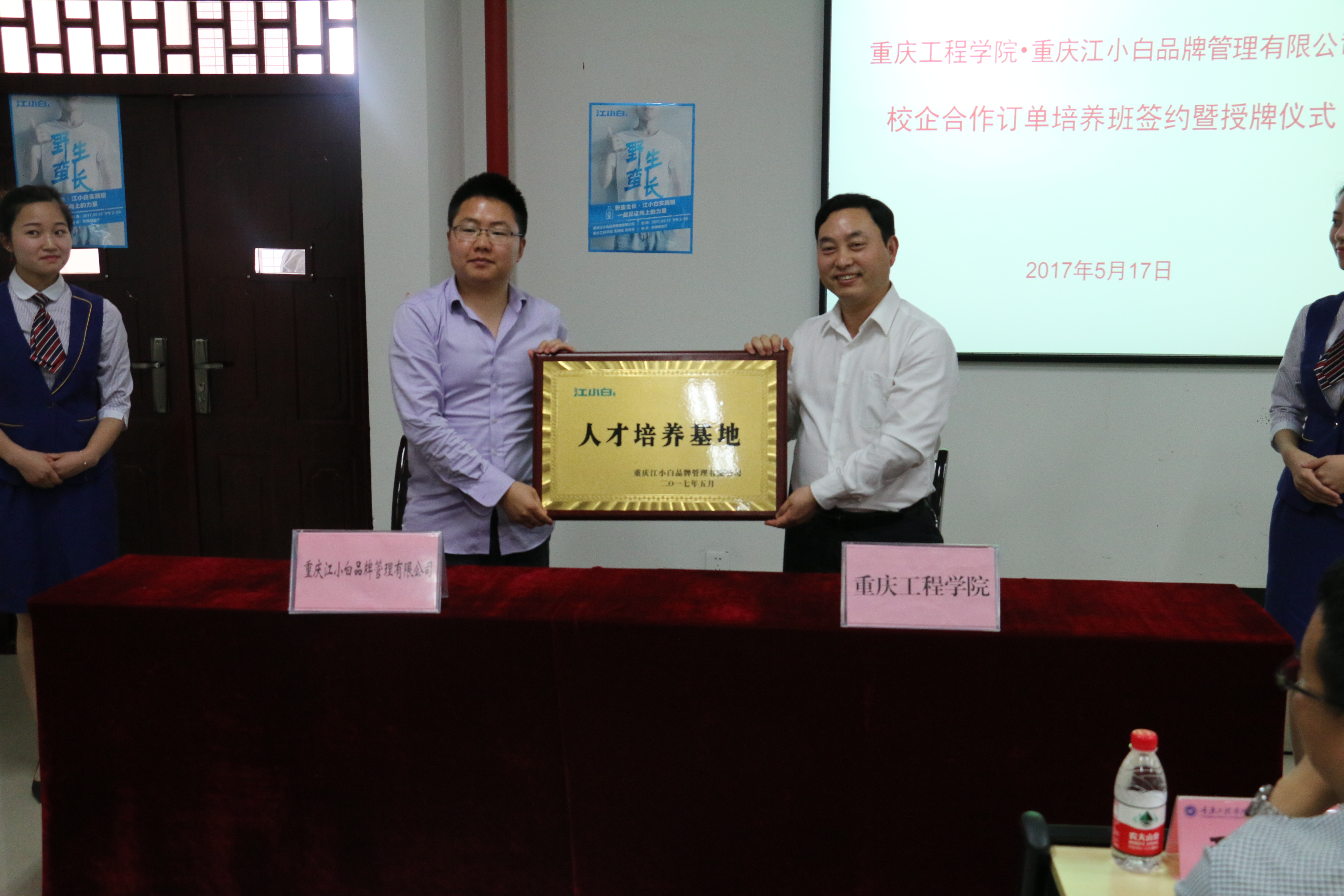 2017年5月17日,我校与重庆江小白品牌管理有限公司(以下简称江小白公司)在第六教学楼203教室举行了订单培养班签约暨授牌仪式。我校党委书记兼常务副校长张业平、招生就业处处长王建东、教务处副处长罗桓、管理学院执行院长简玉刚、江小白公司组织部常务副部长兼人力资源副总监汪应伟、市场拓展部副总监兼总经理助理胡小明、人才学院项目主管林晶、组织部培训专员汪艳秋等人出席了本次签约仪式。