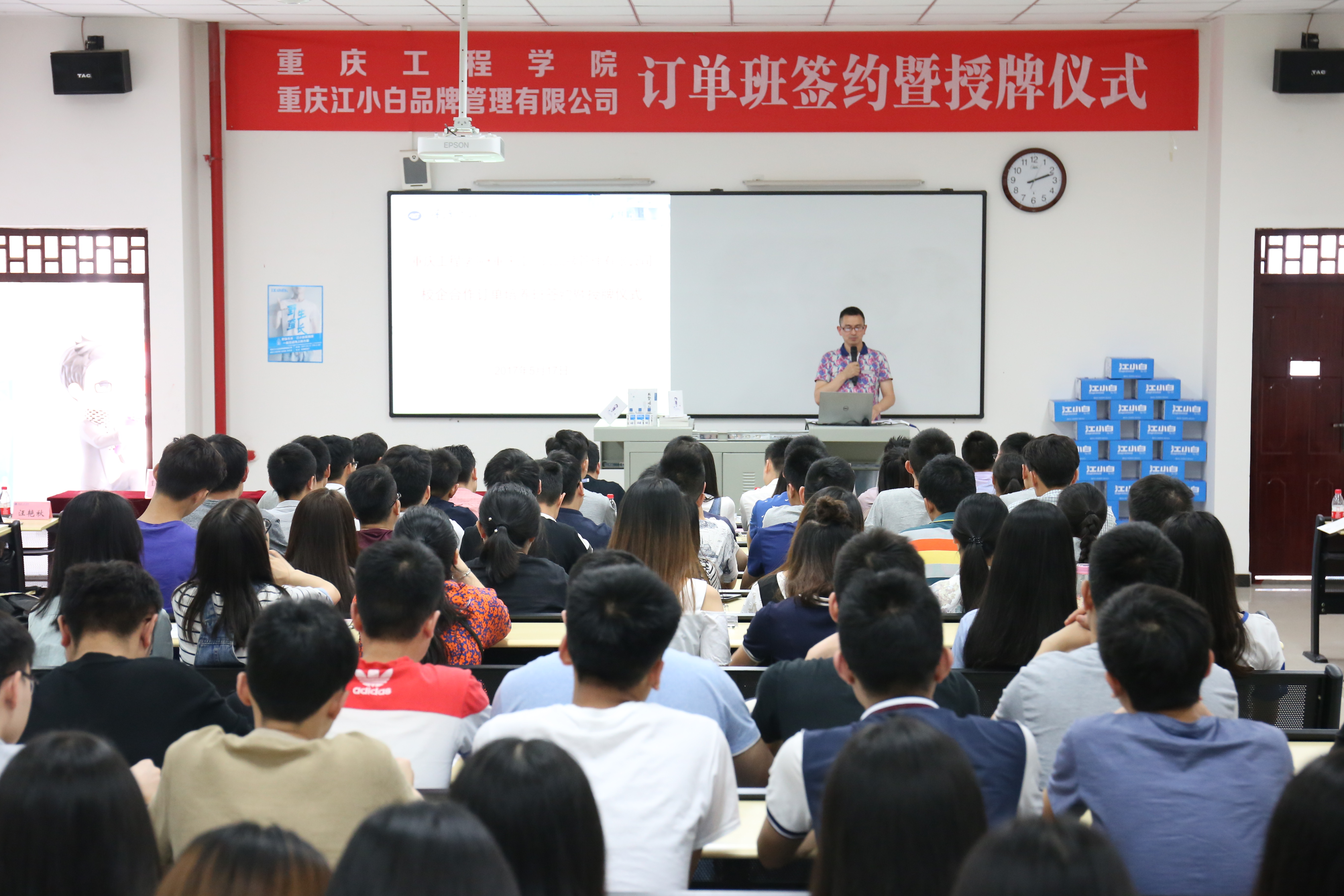 最后江小白公司组织部培训专员汪艳秋进行了订单班宣讲,主要介绍了江小白公司企业文化、发展理念、员工成长通道及本次招聘培训计划。仪式伴随着“我是江小白、生活很简单”的悠扬歌声顺利结束。