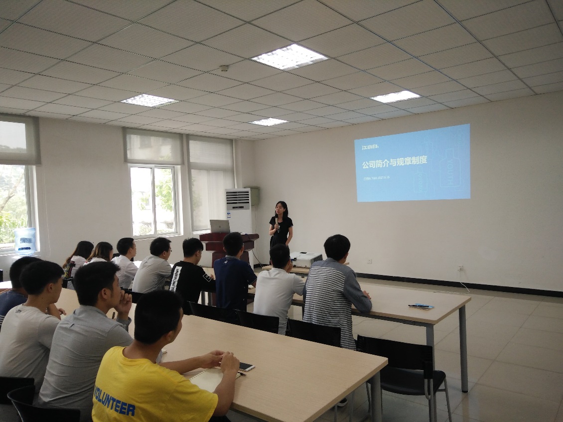 江小白公司人才学院培训师汪艳秋以“公司简介与规章制度”为主题,向订单班全体同学介绍了江小白规章制度,组织构架和人才培养模式。培训期间,汪主管告诉大家,做市场工作很辛苦,不管多么艰辛,都希望大家坚持下来。告诫大家要认真理解组织架构,脚踏实地的工作,一丝不苟地完成领导交待的任务。在培训最后,汪主管强调江小白的人才愿景就是“和你一起,坚持做一个简单、纯粹、创新的奋斗者”。