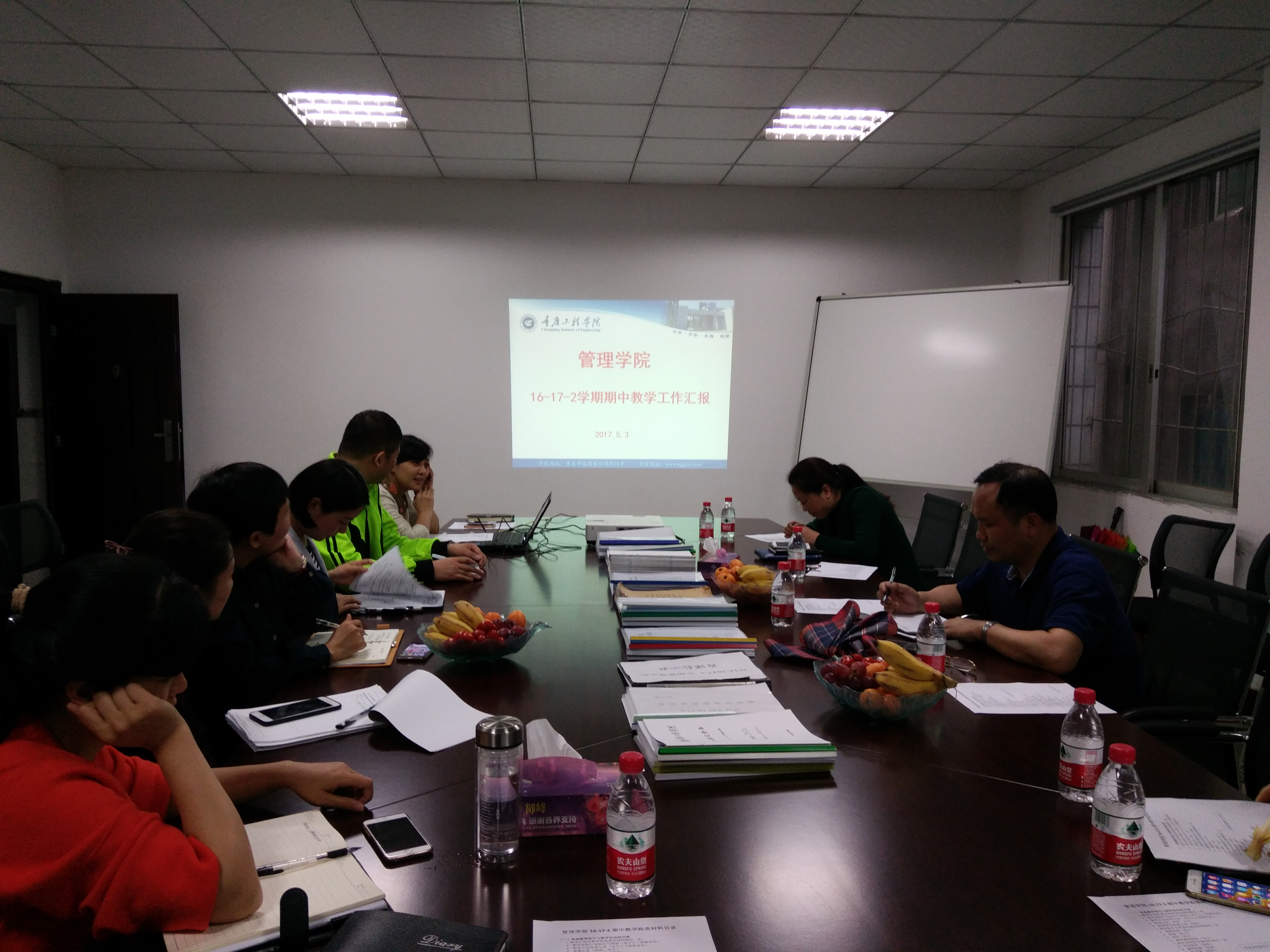 为进一步加强教学管理和教学质量监控,全面掌握本学期开学以来的整体状况,根据“重庆工程学院关于2016~2017学年第二学期期中教学检查的通知”要求,5月3日下午15:00,学校副校长程昌华、副校长王琼花、教务处处长胡继志、工程训练中心副主任陈艳莲及其他教师莅临管理学院开展了16-17-2学期期中教学检查。管理学院执行院长简玉刚、副院长李玲、各教研室主任等人参与了此次工作。