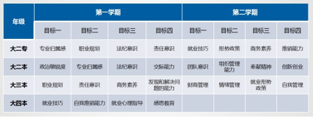 2、细字入手,分类引导。一是建立以提升学生就业技巧和心态的6个就业指导模块(就业定位与生涯发展;就业形势与就业政策;就业技巧;简历制作;就业礼仪;权益维护);二是建立以提升学生安全意识防范的8个安全教育模块(电信诈骗、感情纠纷、交通安全、食品安全、消防安全、校园暴力、校园防盗、校园网贷);三是建立贯穿本科学生在校期间3—7学期20个主题教育,专科学生3—5学期12个主题教育。
