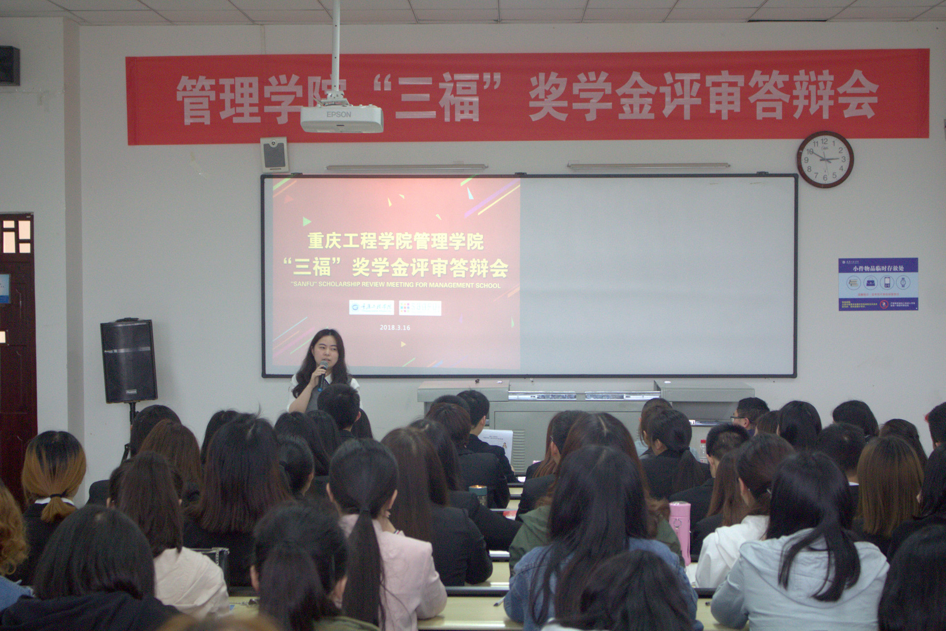 2018年3月16日下午1:00,管理学院“三福”奖学金答辩评审会在6教204教室召开。担任本次评审答辩会的评委有福建省三福百货有限公司西南大区人事经理付莎、福建省三福百货有限公司西南大区招聘主管赵磊、学生工作部副部长黄燕、资助中心刘雪梅、管理学院院长简玉刚、党总支书记邹均。