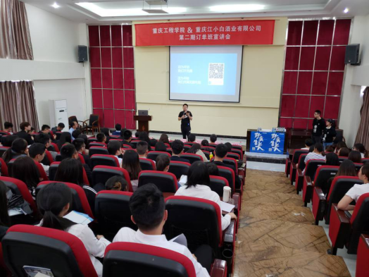 (管理学院 王燕楠)4月9日,管理学院在阶梯报告厅举行了第二届江小白订单班宣讲会。重庆江小白酒业有限公司(以下简称江小白酒业)组织中心副总经理汪应伟,渠道中心副总经理尹朝政,督察部总监刘渠,管理学院院长简玉刚,副院长李玲,实训中心主任陈可,工商管理系主任周小波出席了宣讲会。会议由江小白订单班班主任王燕楠主持。