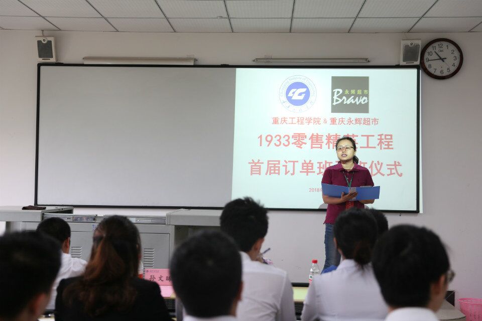 管理学院院长简玉刚、永辉超市渝南区区总孙文晞出席了会议并致辞,同时对同学们提出了要求和期望,首届订单班全体同学参加了开班仪式,订单班学员代表李鱼同学代表全班同学发言,立志于在永辉努力奋斗,早日成材。随后,永辉超市都合广场店店长兼干货品类教练李建华给同学们做了永辉超市企业简介及企业文化方面的专题培训。