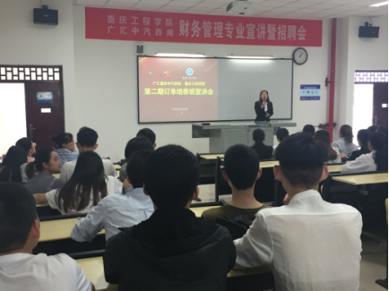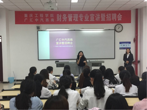 2018年5月4日下午,广汇中汽西南企业负责人刘浏女士来到我校六教304教室针对财务管理系16级80余名学生开展了企业文化宣讲,欢迎大家参与重庆工程学院与中汽西南合作的订单班。会上,刘女士生动全面的介绍了中汽西南的企业简况,同学们也积极发言提问,现场气氛融洽活跃。会议结束以后,31位同学踊跃投递了简历,在参会的3位财务教师的协助下并参与了面试。(财务管理 唐怡)