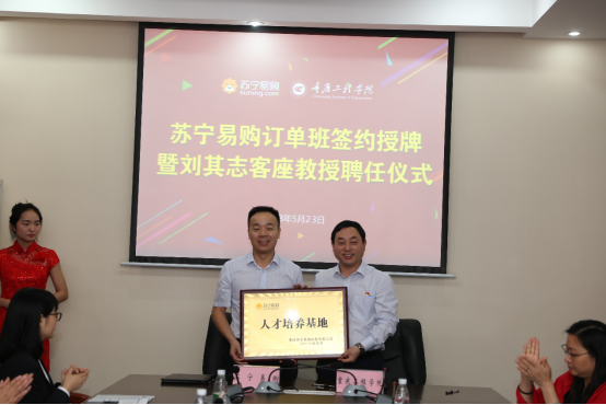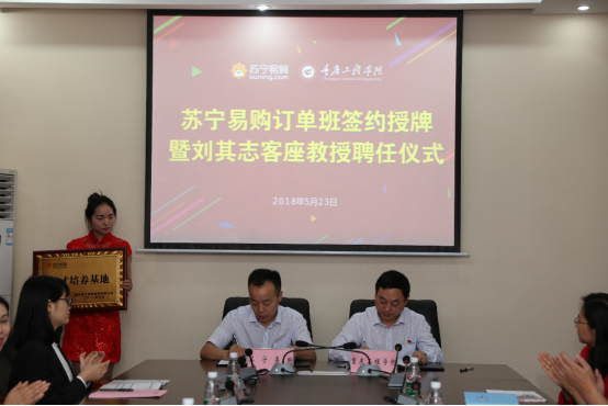 校党委书记兼常务副校长张业平,苏宁重庆地区管理中心总经理刘其志出席了仪式,同时在仪式上张业平书记还聘请了刘其志总经理为我校“客座教授”,并为刘其志总经理颁发了聘书。