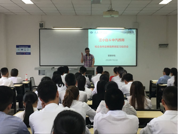 (管理学院  王燕楠) 管理学院自今年4月以来,陆续成立了7个校企合作订单班,通过近两个月的系统培训,同学们即将正式进入企业开展实习工作。为使学生认知实习工作的重要性,更好的适应企业实习工作,7月2日17:00,管理学院召开了江小白、中汽西南和361°订单班的实习动员会。会上,管理学院院长简玉刚对即将开始实习的同学们提出了几点要求,要求大家做好角色转变,做好知识、技能和素养储备,珍惜工作机会,踏踏实实,努力工作,为个人职业发展打下坚实基础。