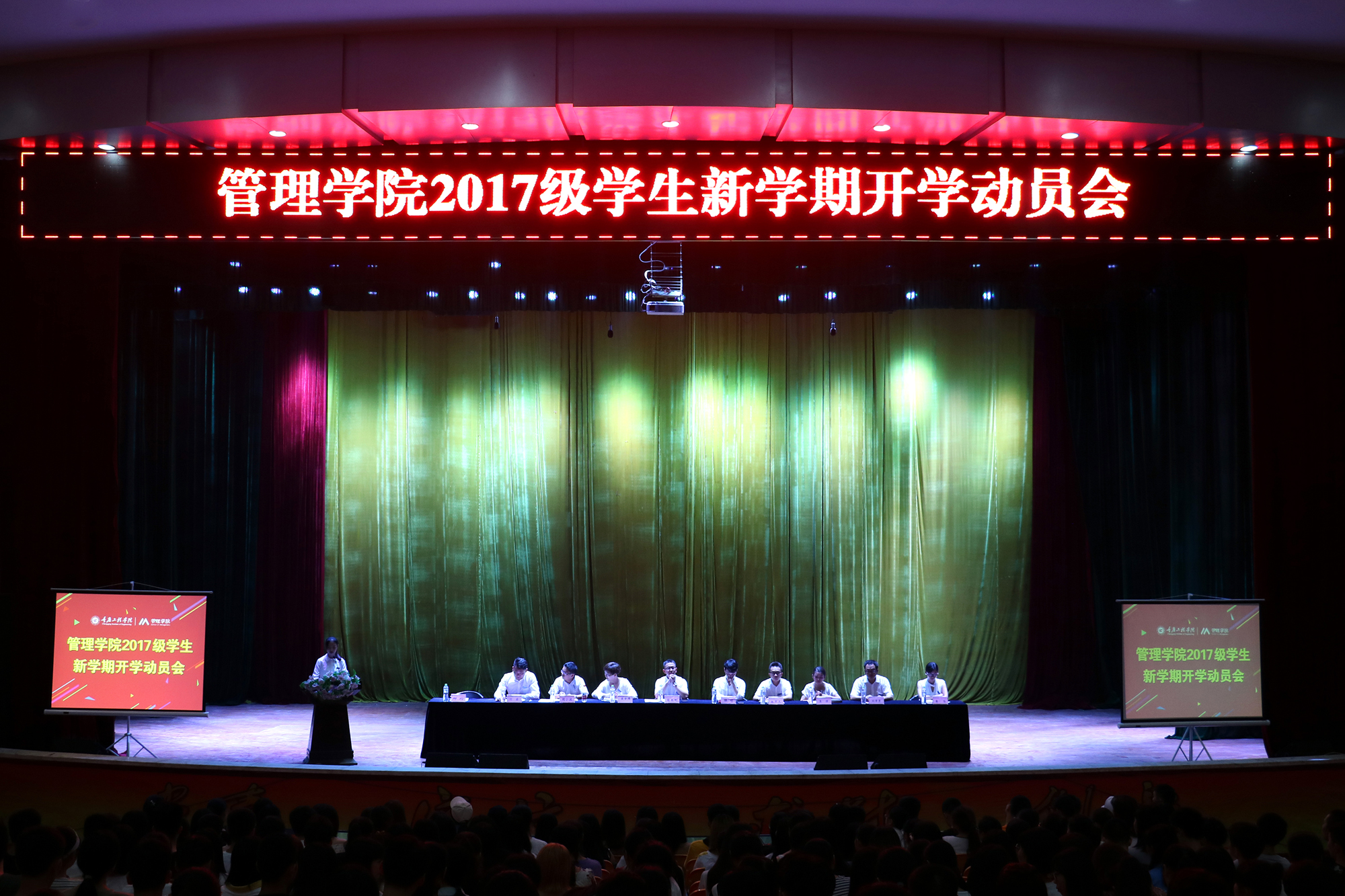 2018年9月5日19:30,管理学院2017级学生新学期开学动员大会在学术报告厅隆重举行。出席本次大会的有管理学院院长简玉刚、党总支书记邹均、副院长陈可等全体院领导,2017级辅导员及全体同学近千人参加动员会。本次动员大会由管理学院党总支部书记邹均主持。