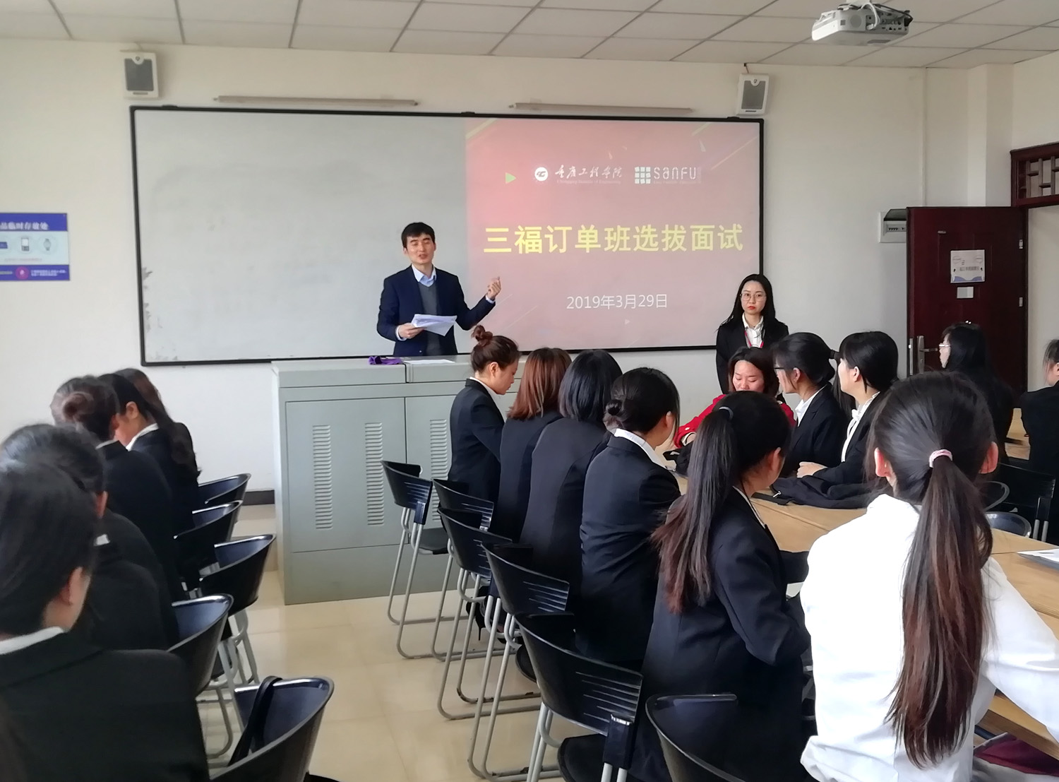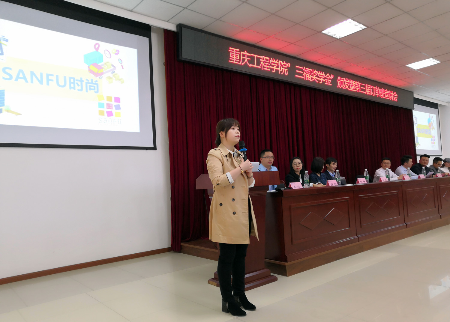 最后,福建省三福百货有限公司西南大区人事经理付莎开展第三届订单培养班宣讲。付经理对三福的发展历史、经营范围、经营理念以及定单培养模式、薪资待遇、晋升通道等都进行了详细介绍,让同学们对三福时尚有了进一步的了解。