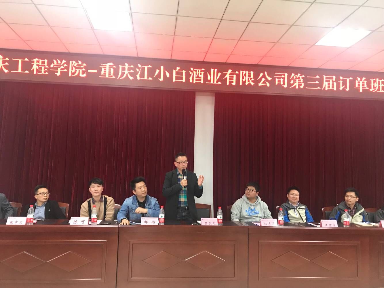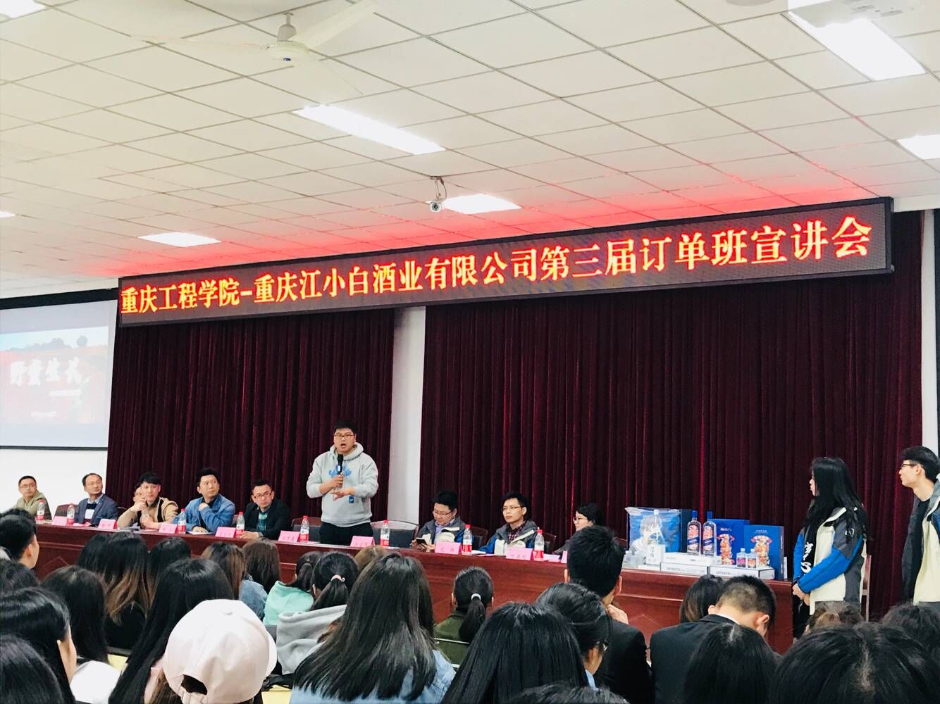 2019年4月3日,管理学院在六教302举行了第三届江小白订单班宣讲会。重庆江小白酒业有限公司(以下简称江小白酒业)组织中心副总经理汪应伟、渠道中心副总经理桂李鑫、管理学院院长简玉刚、党总支书记邹均、副院长陈可,实习实训中心主任张中义出席了宣讲会。会议由工商管理系主任周小波主持。