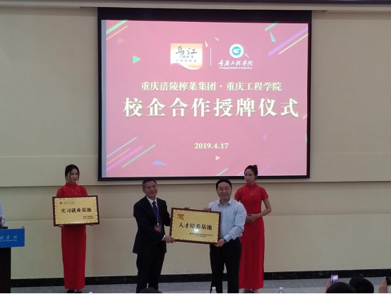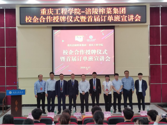 2019年4月17日,管理学院在行政楼阶梯报告厅举行了“重庆工程学院-涪陵榨菜集团校企合作授牌仪式暨首届订单班宣讲会”。涪陵榨菜集团专职党委副书记刘洁、销售公司副总经理幸川、人力资源管理部经理戴季、销售公司销售管理部经理韩静、西南销售大区经理舒进、重庆工程学院党委书记兼常务副校长张业平、招生就业处处长王建东、管理学院党总支书记邹均、副院长陈可出席了本次活动。仪式由管理学院党总支书记邹均主持。