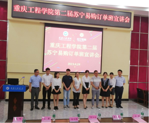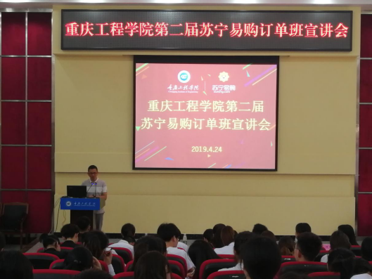 2019年4月24日下午13:00,管理学院在行政楼阶梯报告厅举行“重庆工程学院第二届苏宁易购订单班宣讲会”。苏宁重庆地区管理中心副总经理陈红艳、红孩子公司总经理吴亚、电器公司运营总监刘蔚、人力资源经理何思慧、管理学院院长简玉刚、党总支书记邹均、副院长陈可、实习实训中心主任张中义出席了宣讲会。会议由管理学院工商管理系主任周小波主持。