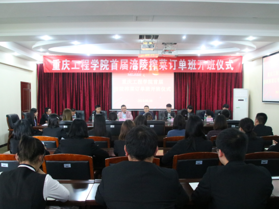 2019年5月8日,管理学院在学校第二会议室举行了首届涪陵榨菜订单班开班仪式。重庆市涪陵榨菜集团股份有限公司销售公司副总经理幸川、人力资源管理部经理戴季、销售公司销售管理部经理韩静、重庆办事处经理周正良、重庆办事处业务主管苏国扬、重庆君翔商贸有限公司总经理邹贤辉、管理学院院长简玉刚、副院长陈可、实习实训中心主任张中义、工商管理系主任周小波参加了会议。会议由涪陵榨菜订单班班主任刘宁主持。