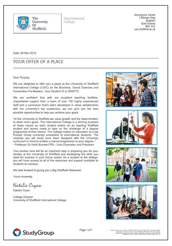 近日,管理学院2016级本科市场营销专业陈睿颖同学同时接到来自英国的两所老牌名校—格拉斯哥大学(University of Glasgow)和谢菲尔德大学(The University of Sheffield)的硕士研究生录取通知书,她最终选择谢菲尔德大学文化创意产业专业攻读硕士研究生。