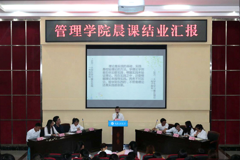 大学是一个青春洋溢的舞台,晨课是一场激情荡漾的盛会。管理学院于20196519:00在阶梯报告厅举办了管理学院2017级晨课结业汇报展示活动。