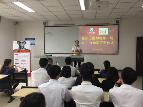 2019年6月19日,管理学院在6218教室举行了“重庆工程学院第二届361°订单班开班仪式”。重庆鲲跃体育用品有限公司零售总监王瑾、管理学院党总支书记邹均、副院长李玲、实习实训中心主任张中义参加加开班仪式。仪式由361°订单班班主任王燕楠主持。