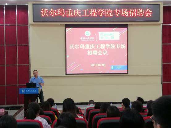 为了进一步深化“校企合作、产教融合”的办学理念、扩宽学生的就业渠道,2019年7月8日13:30,管理学院在在行政楼阶梯报告厅举行沃尔玛重庆工程学院专场招聘会。出席本次招聘会的有沃尔玛(重庆)有限公司总经理梁彦良、人力资源经理杜巧莉、范梦莎、王颖洁,重庆工程学院管理学院院长简玉刚、党总支书记邹均、副院长陈可、实习实训中心主任张中义。管理学院工商管理系主任周小波主持本次招聘会。