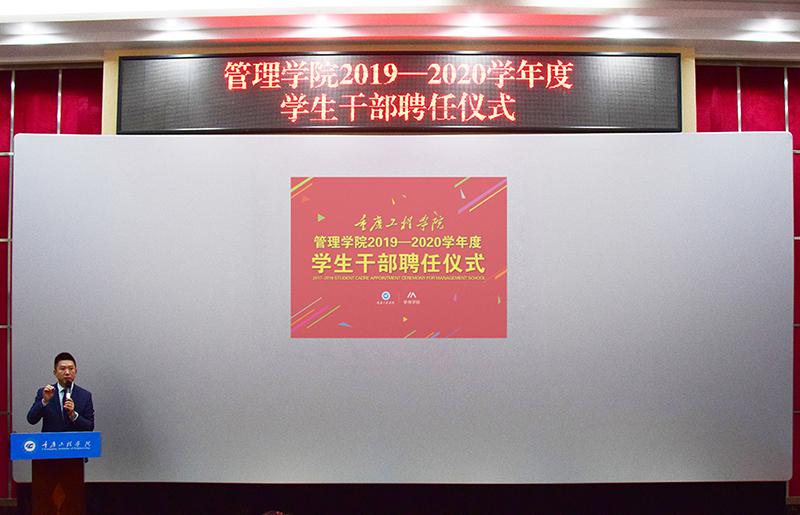 2019年10月30日17:30,管理学院2019—2020学年度学生干部聘任仪式在行政楼阶梯报告厅举行,校团委书记兼学工部副部长黄涛、管理学院党总支书记邹均、学生工作室主任兼团委书记付睿、团委副书记陈姝璇出席本次仪式。学院全体学生会成员、学生助理、班级主要学生干部参与受聘。仪式由学生会主席团助理胡凯主持。