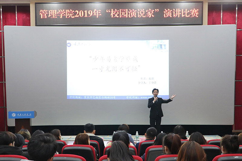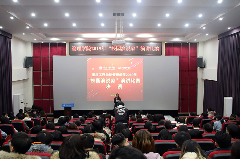 为进一步加强学风、校风建设,丰富大学生文化艺术生活,锻炼同学们的演讲能力和口头表达能力,给同学们提供一个展现自我,提升自我的机会和舞台,提升学生综合素质,2019年12月11日18:30,管理学院2019年度“校园演说家”演讲比赛决赛在行政楼阶梯报告厅隆重举行,重庆工程学院学工部部长黄燕、管理学院党总支书记及学院辅导员老师担任比赛评委,共计200余名学生现场观摩。