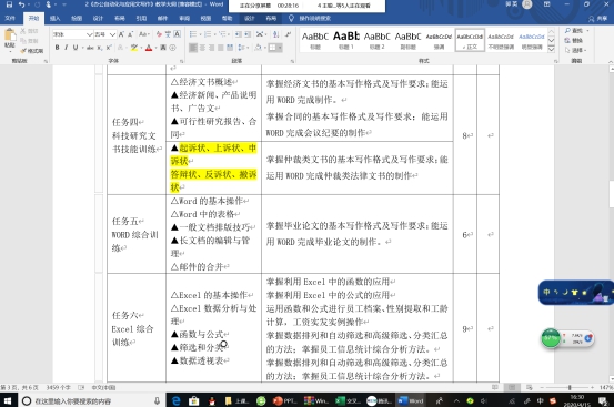 首先,唐怡老师就本学期负责建设的课程《办公自动化与应用文写作》进行了课程内容体系的介绍,课程内容主要分成应用文写作和办公软件操作两部分内容。应用文写作主要包含日常办公行文、公务行文等四个方面内容和Word、Excel、PPT三个部分内容。通过讨论确定了最终每个部分的具体学时,以及在课程建设中的注意事项。其次,宋廷昌老师就自己负责的《组织行为学》课程进行了课程体系的梳理,经过老师们的共同讨论,将该课程中与管理学和人力资源管理概论中重复的内容进行了界定,重新确定了学时。最后是王聪老师就个人所负责的《人力资源管理认知实习》就行了课程内容和学时安排的介绍,经过老师们的共同讨论最终确定了四次课程的具体内容安排,以及在认知实训中的具体流程。教研活动中除了对课程内容体系进行了梳理,同时还对每门课程的选用教材进行了确定。