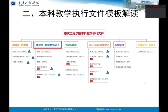 其次,教研活动的第二个主题是解读教务处发布的教学执行文件模板。通过介绍不同类型的课程,理论课、理论实践课、实习实训课、独立实验课程等不同课程应该具备的具体教学文件,包括教学大纲、教学进度计划表、教学教案、实习指导书、实验报告等具体文档的填写要求,尤其是新版教案要更新的内容较多,郭老师选用具体教学过程和思路进行了模板讲解,让老师们系统的了解了此次新教学文件填写的要求。