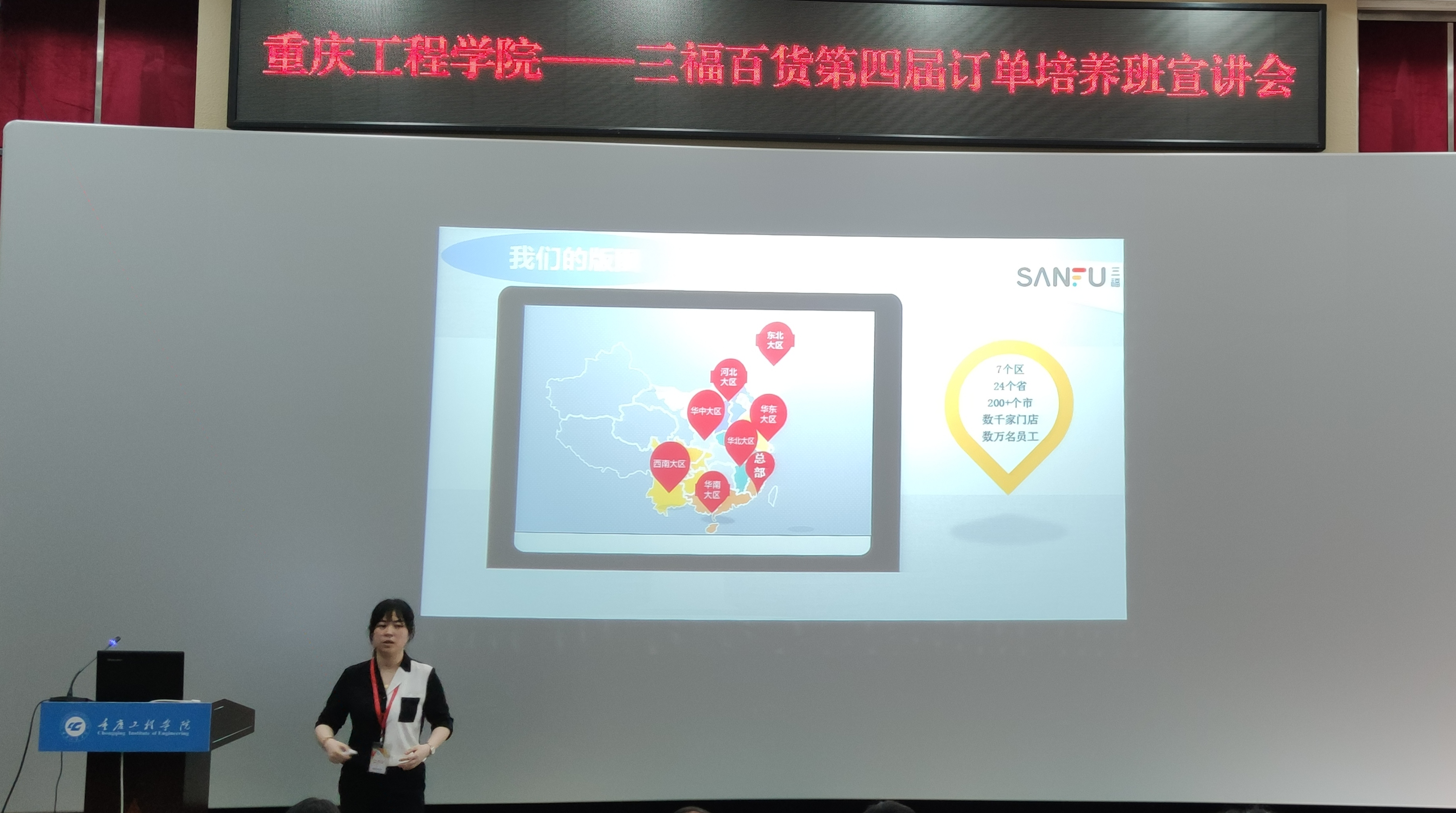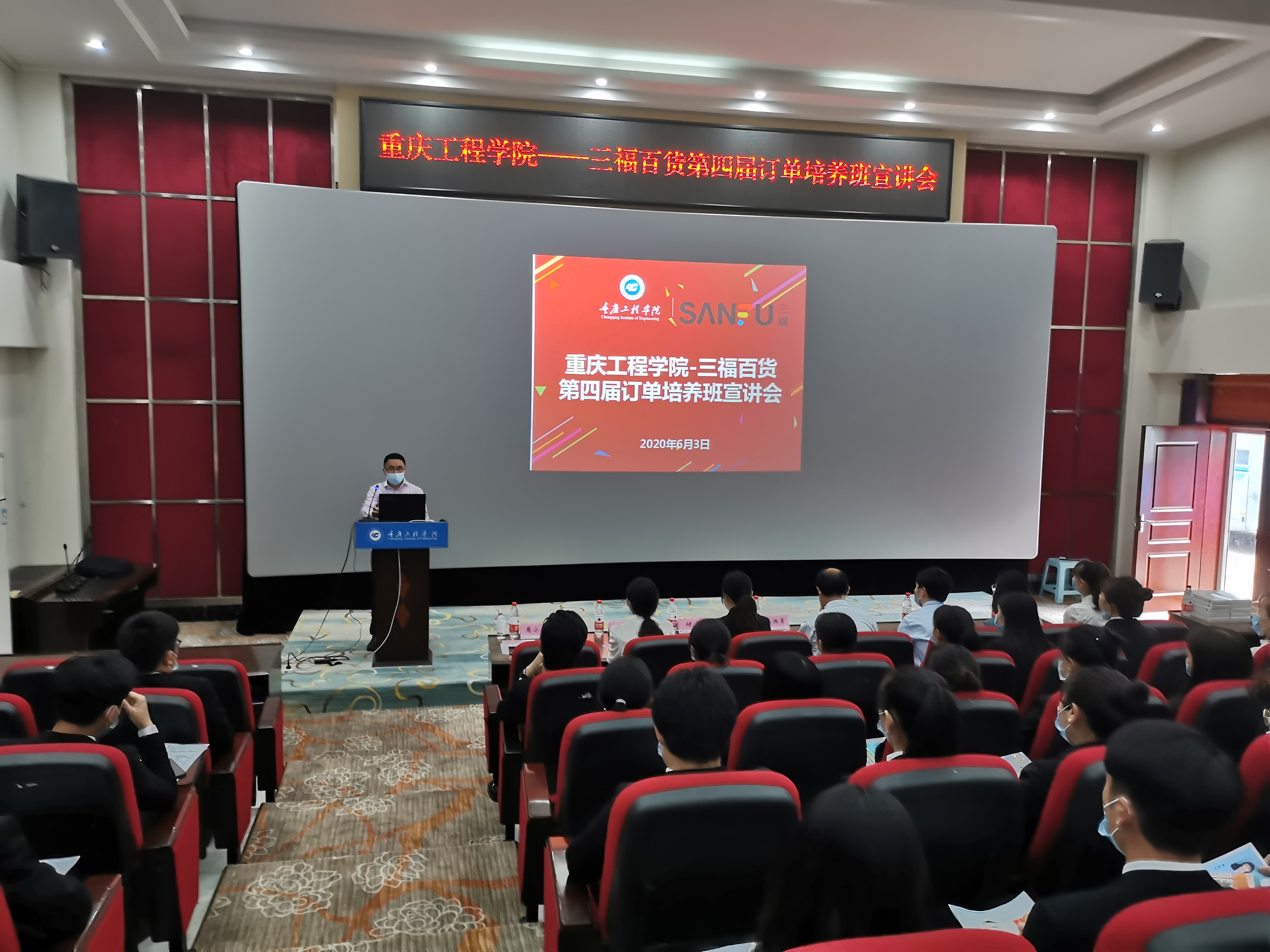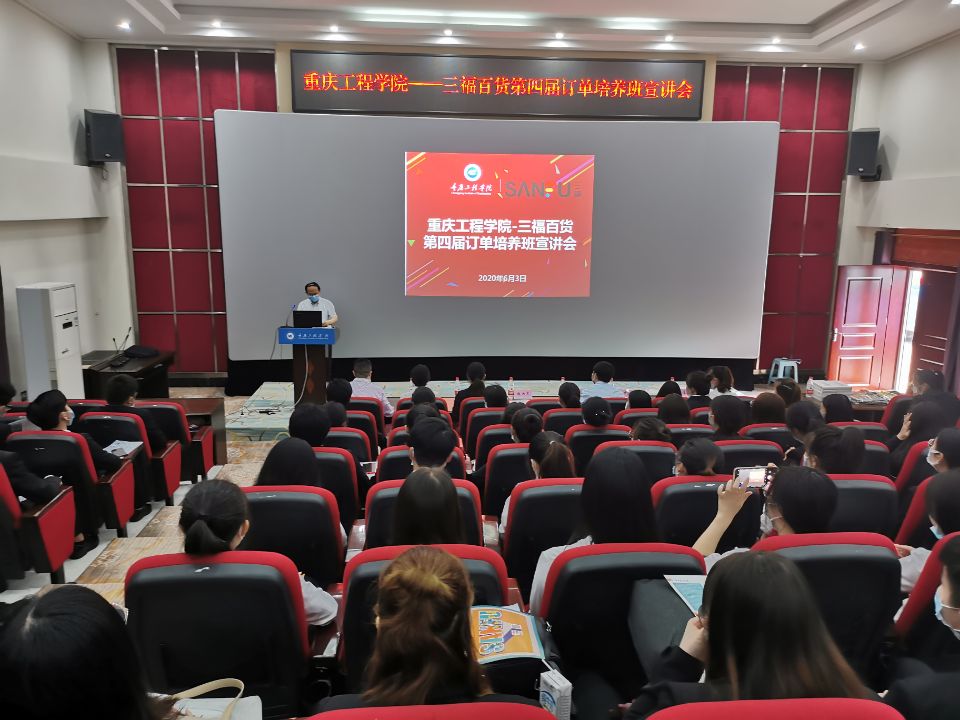 为了深入贯彻学校“校企合作、产教融合”人才培养模式,拓宽毕业生实习就业渠道,实现以需促学,学以致用的目的,2020年6月3日(周三)下午13:00,管理学院在阶梯报告厅举行了市场营销专业三福百货第四届订单培养班宣讲招聘会。福建省三福百货有限公司西南大区人事经理付莎、招聘主管赵磊一行出席了本次仪式。管理学院院长梅洪常、实习实训中心主任张中义、三福班班主任肖礼,部分教师代表以及2017级市场营销本科专业学生参加仪式。会议由管理学院工商管理系系主任周小波主持。