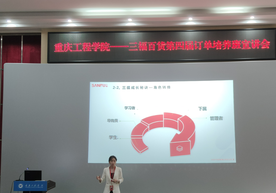 一直以来,重庆工程学院秉承“通识教育+专业教育+行业教育”校企合作、产教结合的人才培养模式,管理学院积极探索校企合作模式以及拓展校企合作的深度,得到了社会各界企业,特别是三福给予的大力支持,得到了同学们的高度认可,取得了丰硕的成果。相信我校与三福时尚的校企合作会培养出适应时代、行业、企业发展需要的创新型应用人才,实现学院、企业、学生的三方共赢!
