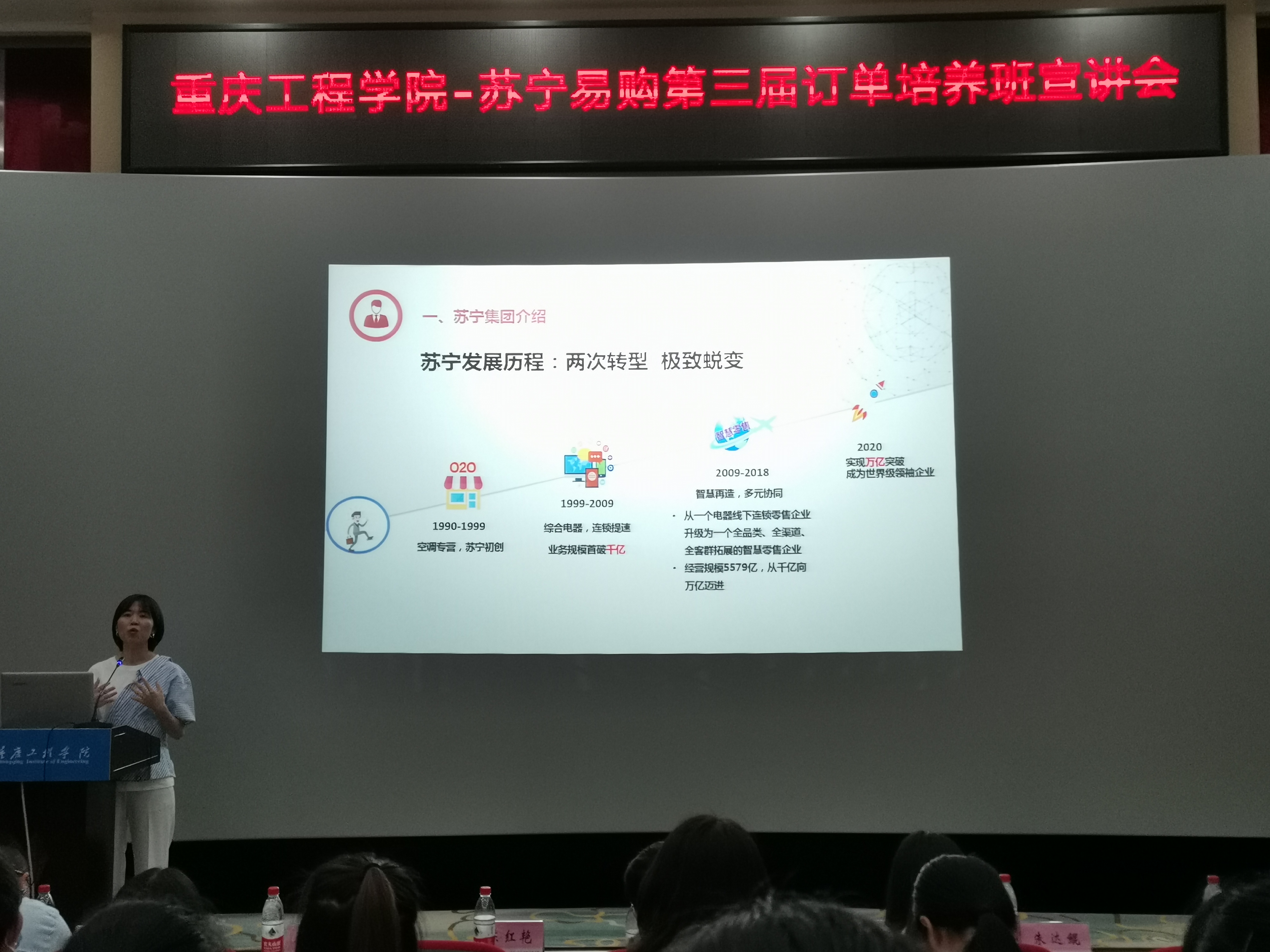 最后,苏宁重庆地区管理中心副总经理陈红艳开展订单班宣讲,就企业文化、工作岗位、晋升通道、薪酬福利等方面进行了详细的讲解,赢得了同学们热烈的掌声。