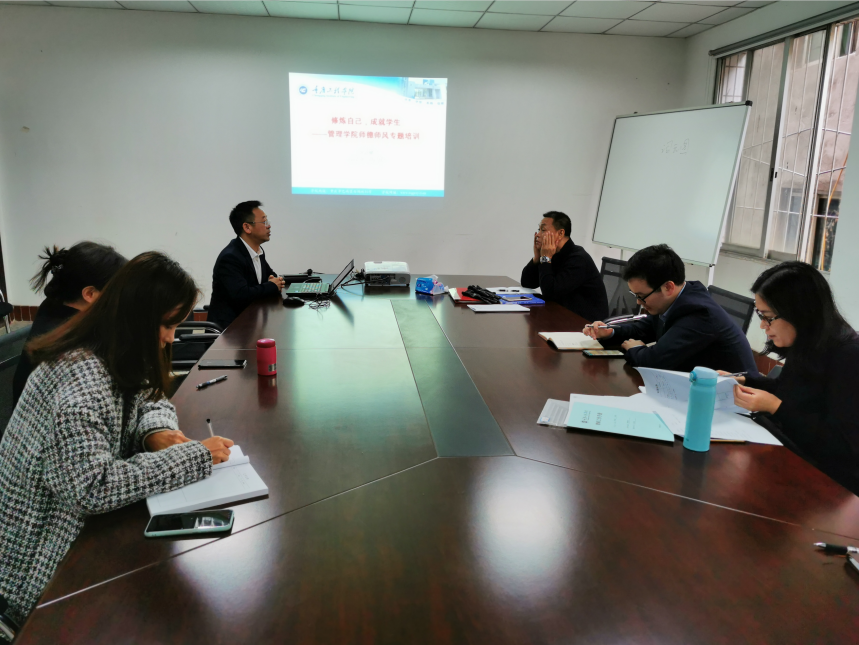 2020年10月16日,3313会议室,管理学院党总支书记刘达斌为新教师开展题为“修炼自己,成就学生”师德师风专题培训。