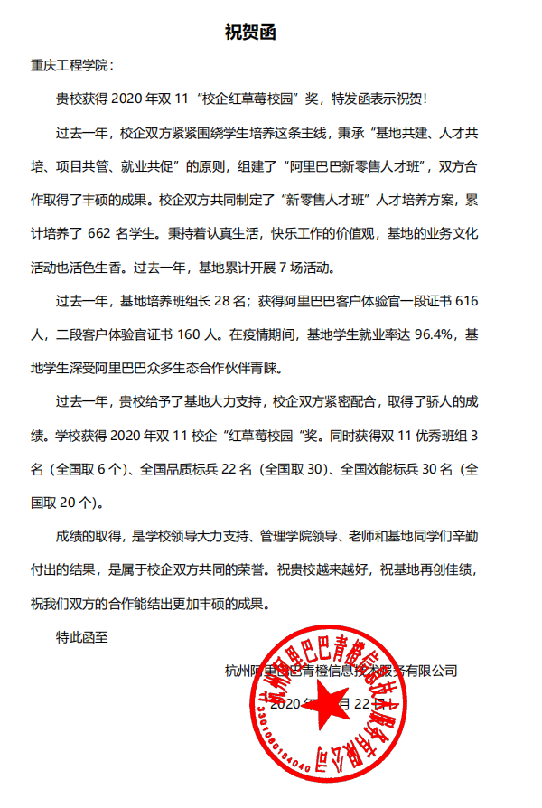 2020年12月24日,杭州阿里巴巴青橙信息技术有限公司发来祝贺函,祝贺我校“阿里巴巴新零售人才孵化基地”再次获得双11“校企红草莓校园”奖,这已经是我校连续三届获得此奖项。