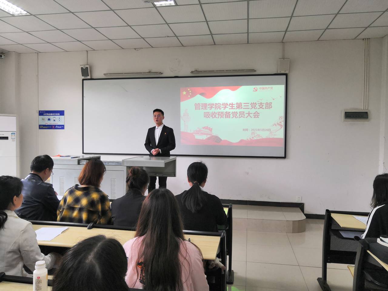 为进一步做好发展党员工作,保持党的先进性纯洁性,保持党员队伍生机活力,2021年5月26日13:00,管理学院学生第一、二、三党支部在三教301、六教113、六教118教室分别召开了吸收预备党员大会。会议由各党支部书记主持,支部正式党员、预备党员、发展对象及入党介绍人参加了本次会议。